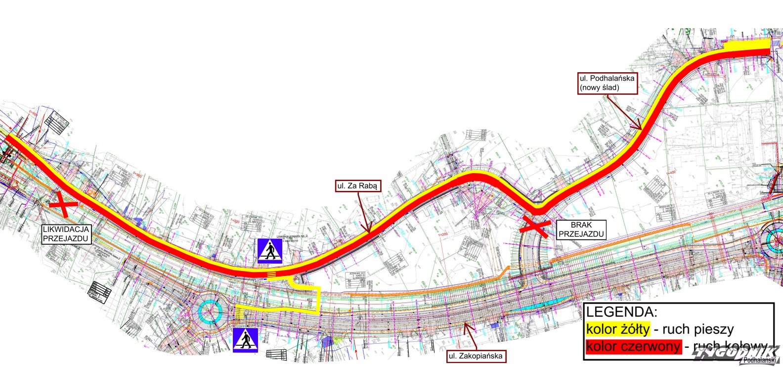 Jak informuje wykonawca przebudowy linii kolejowej w centrum Rabki, w najbliższy piątek (13.06), od godziny 8.00 planuje się wdrożenie kolejnego etapu tymczasowej organizacji ruchu, polegającego na likwidacji istniejącego przejazdu przez torowisko (usytuowanego w rejonie ul Zakopiańskiej nr 35) łączącego ul. Za Rabą z ul. Zakopiańską. Ruch kołowy z ul Za Rabą zostaje przekierowany na nowo wykonany odcinek ul. Podhalańskiej w kierunku skrzyżowania ze starym śladem ul. Podhalańskiej (bez możliwości wjazdu pod nowo wybudowany wiadukt kolejowy) – na poniższej mapie orientacyjnej oznaczono kolorem czerwonym. Ruch pieszy z ul. Za Rabą zostaje przekierowany na nowo wykonane chodniki w ciągu ul. Za Rabą oraz na tymczasowy ciąg pieszy biegnący przez plac budowy łączący ul. Za Rabą z ul. Zakopiańską (na wysokości składu Trans-Marino) – na poniższej mapie orientacyjnej oznaczono kolorem żółtym.