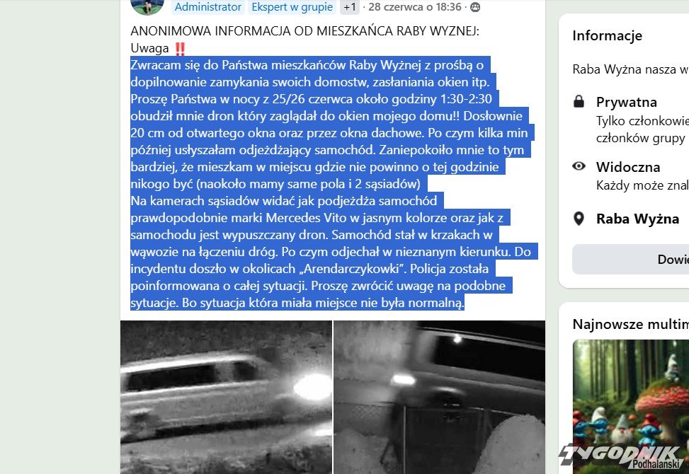 Informacja o niepokojącym incydencie pojawiła się na jednej z grup facebookowych skupiających mieszkańców Raby Wyżnej. - W nocy z 25/26 czerwca około godziny 1:30-2:30 obudził mnie dron który zaglądał do okien mojego domu. Dosłownie 20 cm od otwartego okna oraz przez okna dachowe. Po czym kilka min później usłyszałam odjeżdżający samochód. Zaniepokoiło mnie to tym bardziej, że mieszkam w miejscu gdzie nie powinno o tej godzinie nikogo być (naokoło mamy same pola i 2 sąsiadów) - relacjonował jeden z anonimowych członków grupy. - Na kamerach sąsiadów widać jak podjeżdża samochód prawdopodobnie marki Mercedes Vito w jasnym kolorze oraz jak z samochodu jest wypuszczany dron. Samochód stał w krzakach w wąwozie na łączeniu dróg. Po czym odjechał w nieznanym kierunku. Do incydentu doszło w okolicach „Arendarczykowki”. Policja została poinformowana o całej sytuacji. Proszę zwrócić uwagę na podobne sytuacje. Bo sytuacja która miała miejsce nie była normalną.