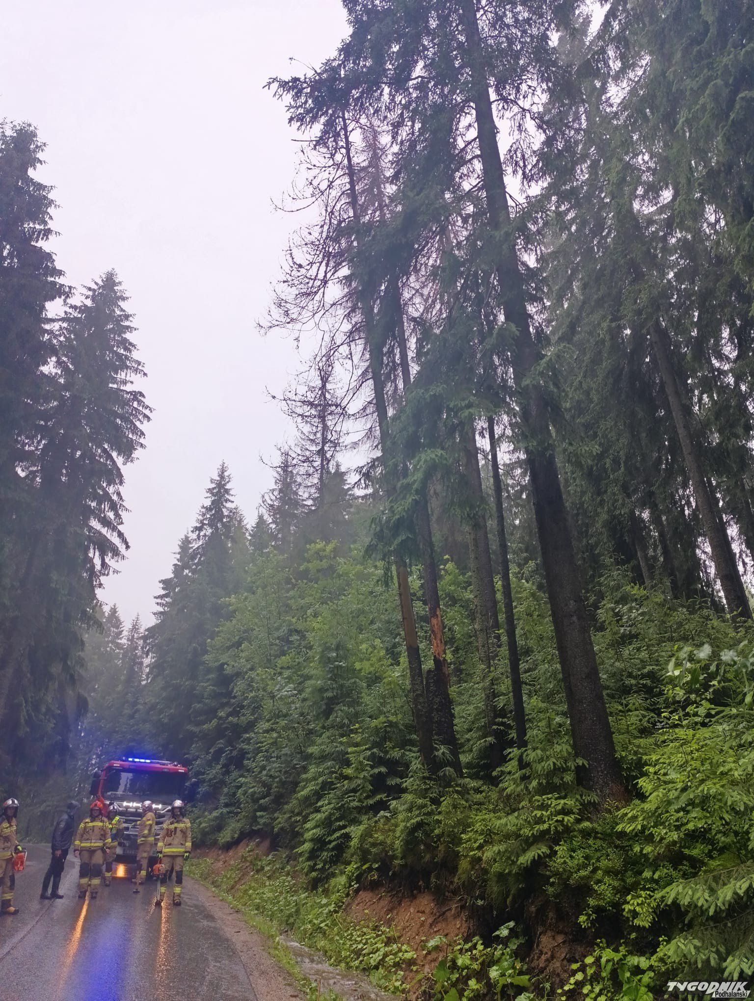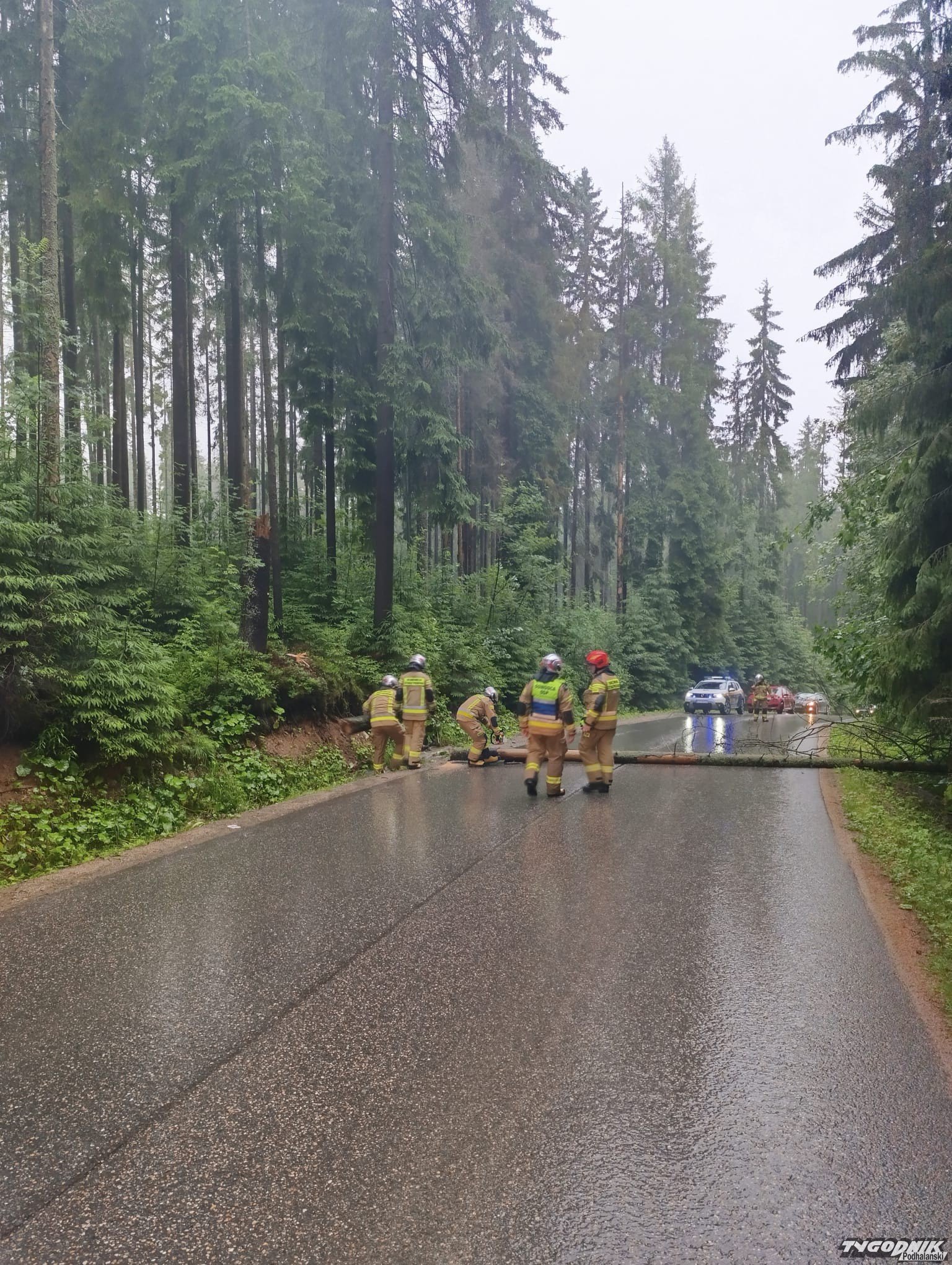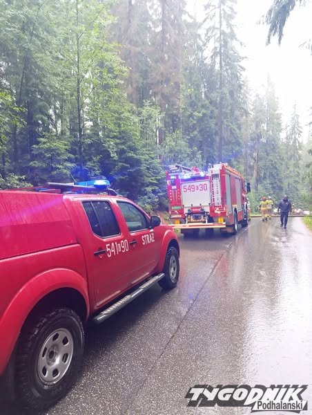 W Kościelisku na drogę spadło drzewo, które nie wytrzymało naporu burzowej nawałnicy. Droga jest chwilowo nieprzejezdna, nad usunięciem przeszkody pracują strażacy.