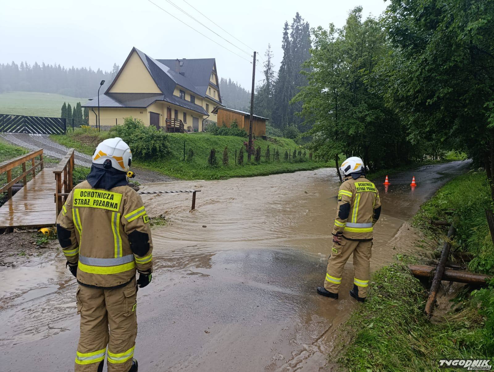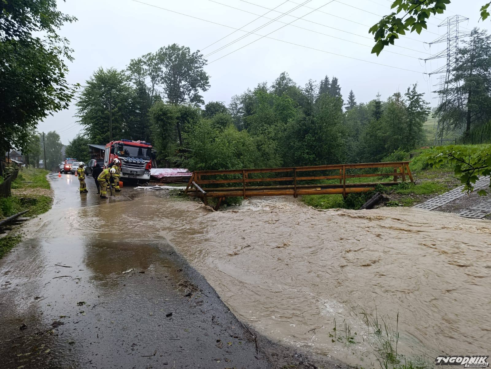 Strażacy w trakcie dzisiejszej ulewy interweniowali w Nowem Bystrem, wezwani do zalanej drogi. Spływająca z pól woda błyskawicznie wypełniła rów odwadniający i zmieniła potok w rwącą rzekę, która podtopiła ulicę.