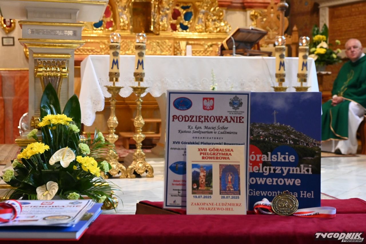 Jan Blańda i Kazimierz Bielak z Towarzystwa Cyklistów "Orzeł" ze Spytkowic przekazali na zakończenie Mszy św. ludźmierskim duszpasterzom i siostrom zakonnym tegoroczne materiały pielgrzymkowe, w tym medal, zawieszkę - emblemat na rower oraz specjalne podziękowanie. Ofiarowali także ciekawą pozycję albumową, która zawiera opis wszystkich dotychczasowych pielgrzymek rowerowych z Zakopanego na Hel. Pątnikom patronuje Związek Podhalan.
