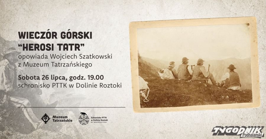 Muzeum Tatrzańskie zaprasza w sobotę 26.07 o godzinie 19 do schroniska PTTK w Dolinie Roztoki na wieczór górski "Herosi Tatr", który poprowadzi Wojciech Szatkowski.