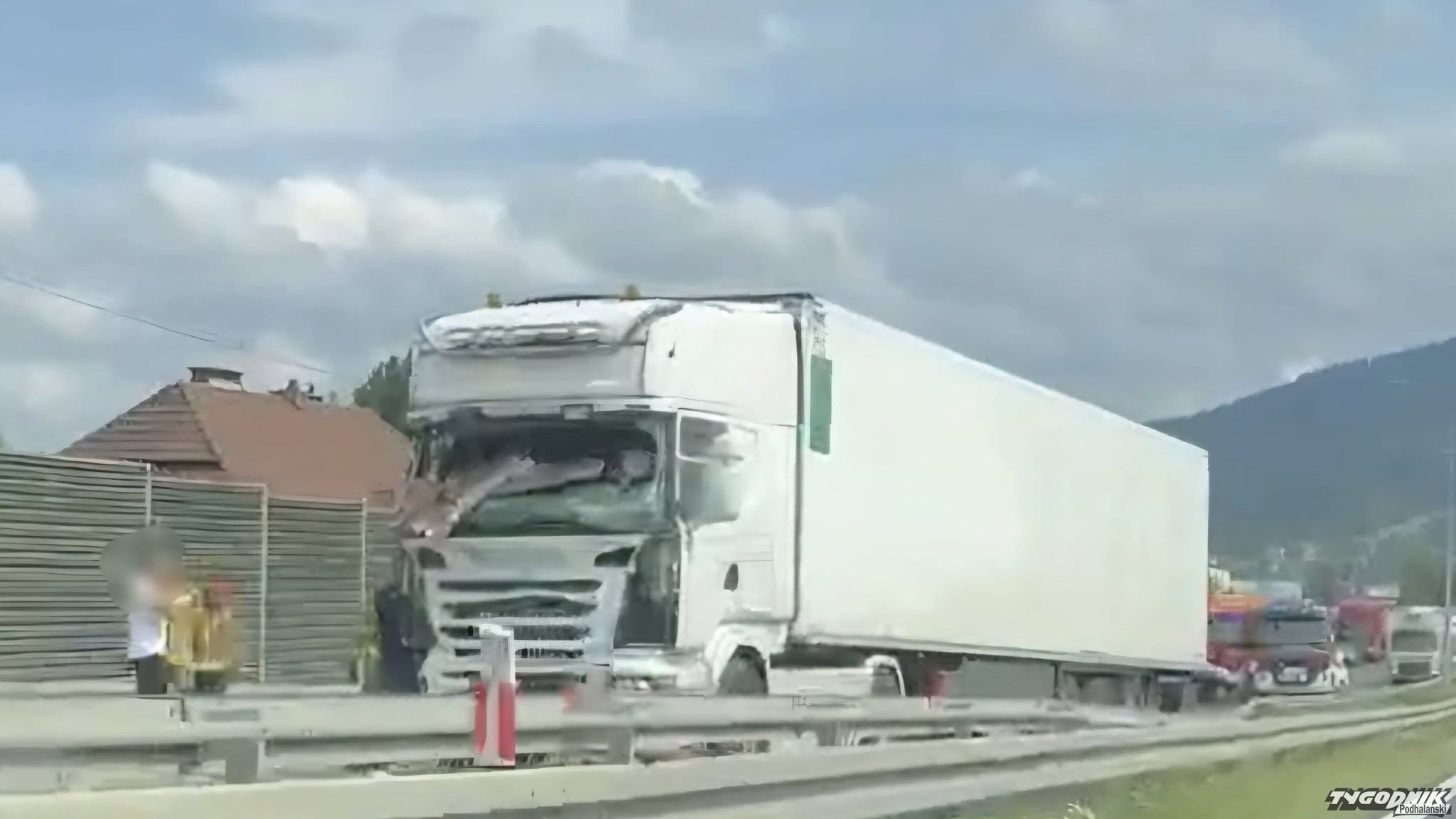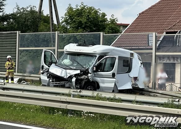 W Myślenicach na zakopiance kamper zderzył się z samochodem ciężarowym.