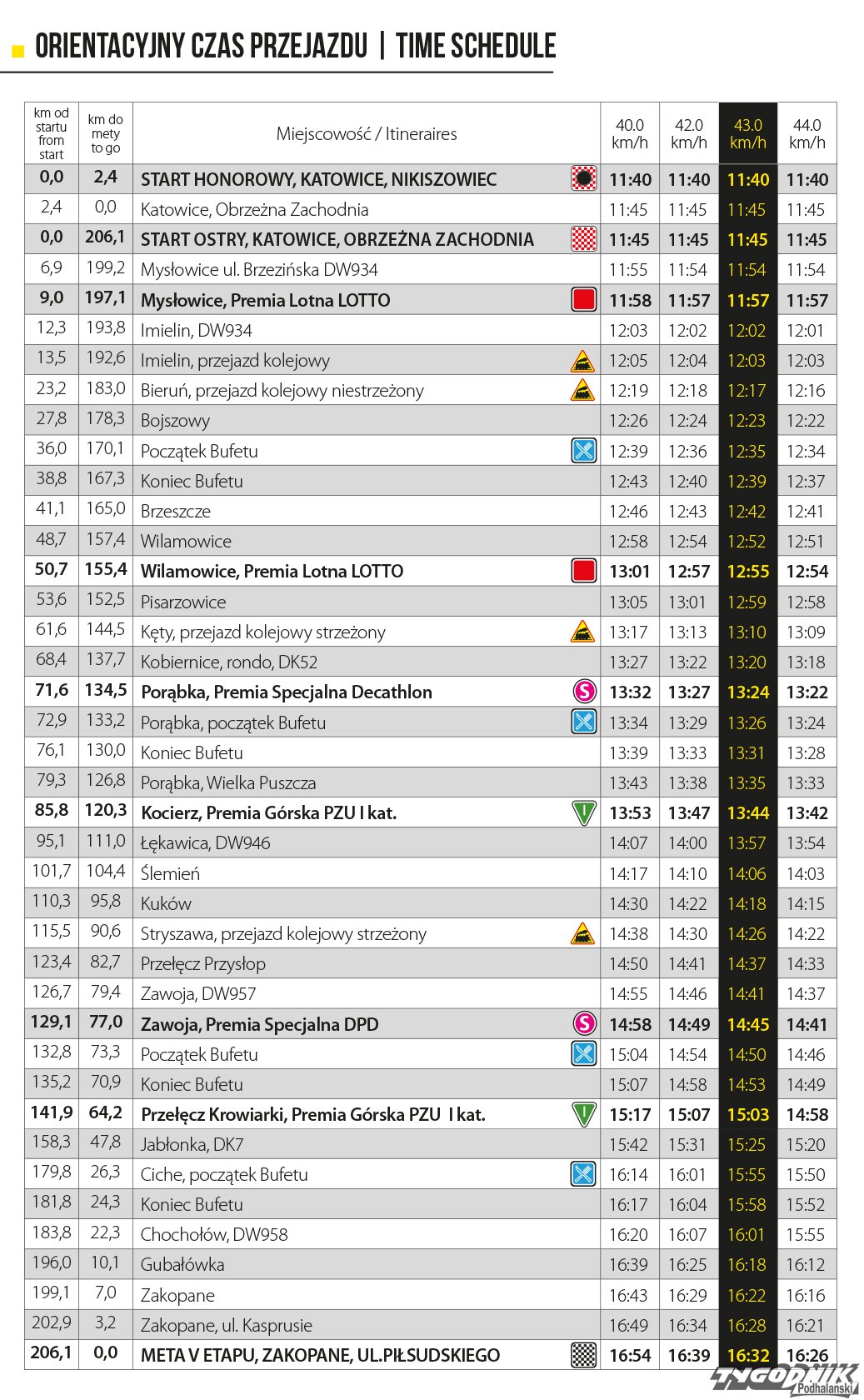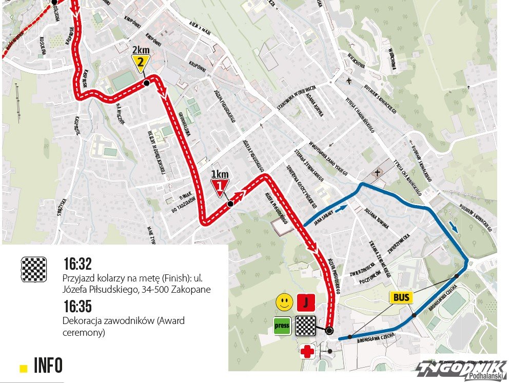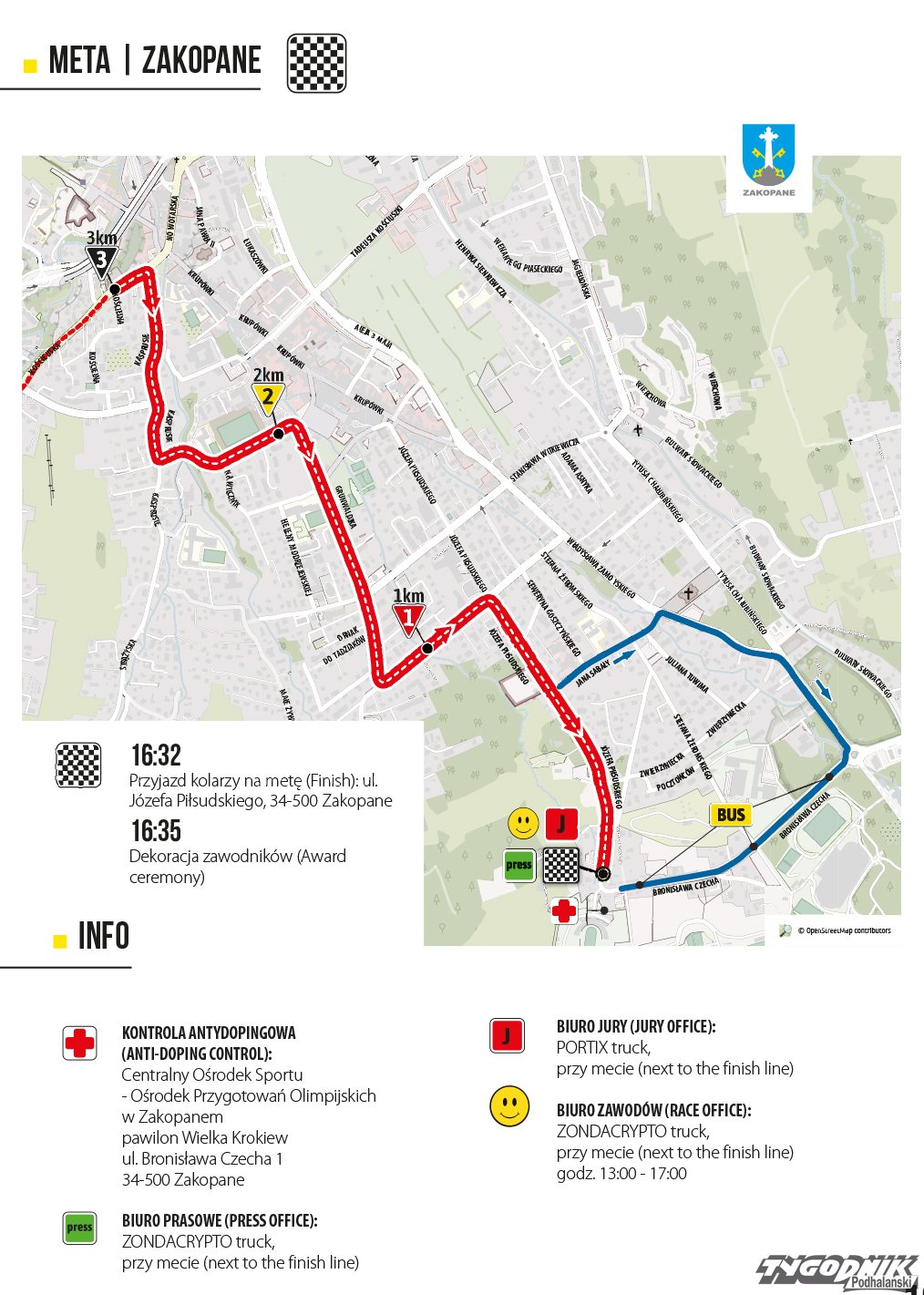 Kolarze na Podhale wjadą przez Przełecz Krowiarki, Jabłonkę, Czarny Dunajec, Chochołów, Gubałówkę. W Zakopanem przejadą ul. Kościeliską, Kasprusiami, Orkana, Grunwaldzką, Makuszyńskiego i Piłsudskiego na metę pod Wielką Krokiew. Na Przełęczy Krowiarki zależnie od tempa jazdy mają się pojawić ok. godz. 15, a na mecie w Zakopanem ok. godz. 16:50.