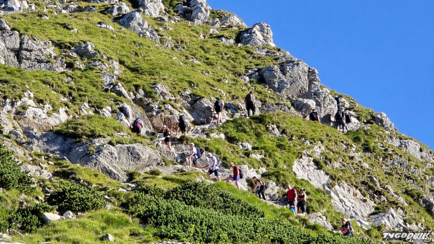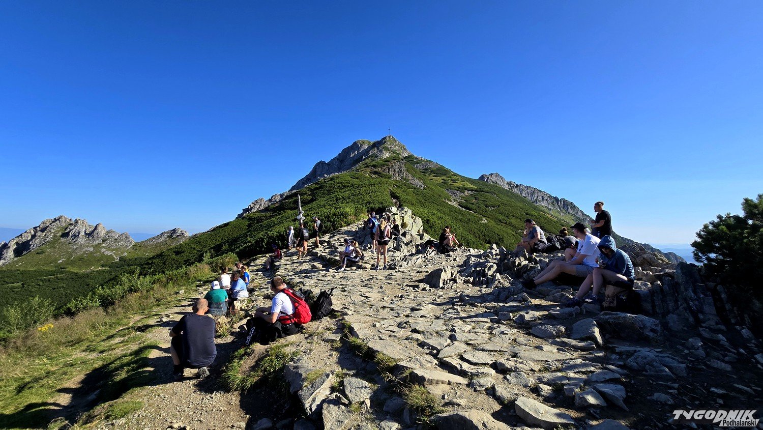 Z każdą godziną turystów będzie przybywać. Już o godz. 8 na szlaku z Hali Kondratowej usłyszeliśmy takie zdanie: "Idźcie szybciej, zajmijcie mi miejsce w kolejce, a ja was dogonię". To była jeszcze o tej porze lekka przesada, ale nawet wtedy pod łańcuchami w kopule szczytowej trzeba było poczekać w małej kolejce. Pewnie największe tłumy będą zdobywać Giewont około południa. Pogoda dziś wymarzona, świeci słońce, temperatura rośnie. Pamiętajcie tylko o nakryciu głowy i dużej ilości płynów. Na zdjęciach i filmie szlak na Giewont w rejonie Wyżniej Kondrackiej Przełęczy o godz. 8 rano.