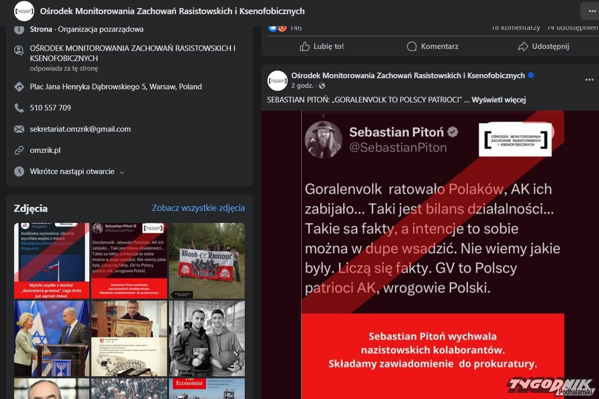Za wychwalanie totalitarnego ustroju i komentarze zamieszczone przez Sebastiana Pitonia w sieci Ośrodek Monitorowania Zachowań Rasistowskich i Ksenofobicznych składa zawiadomienie do prokuratury. "Goralenvolk ratowało Polaków, AK ich zabijało" - to jeden z cytatów wypowiedzi Pitonia, jakie podaje OMZRiK.