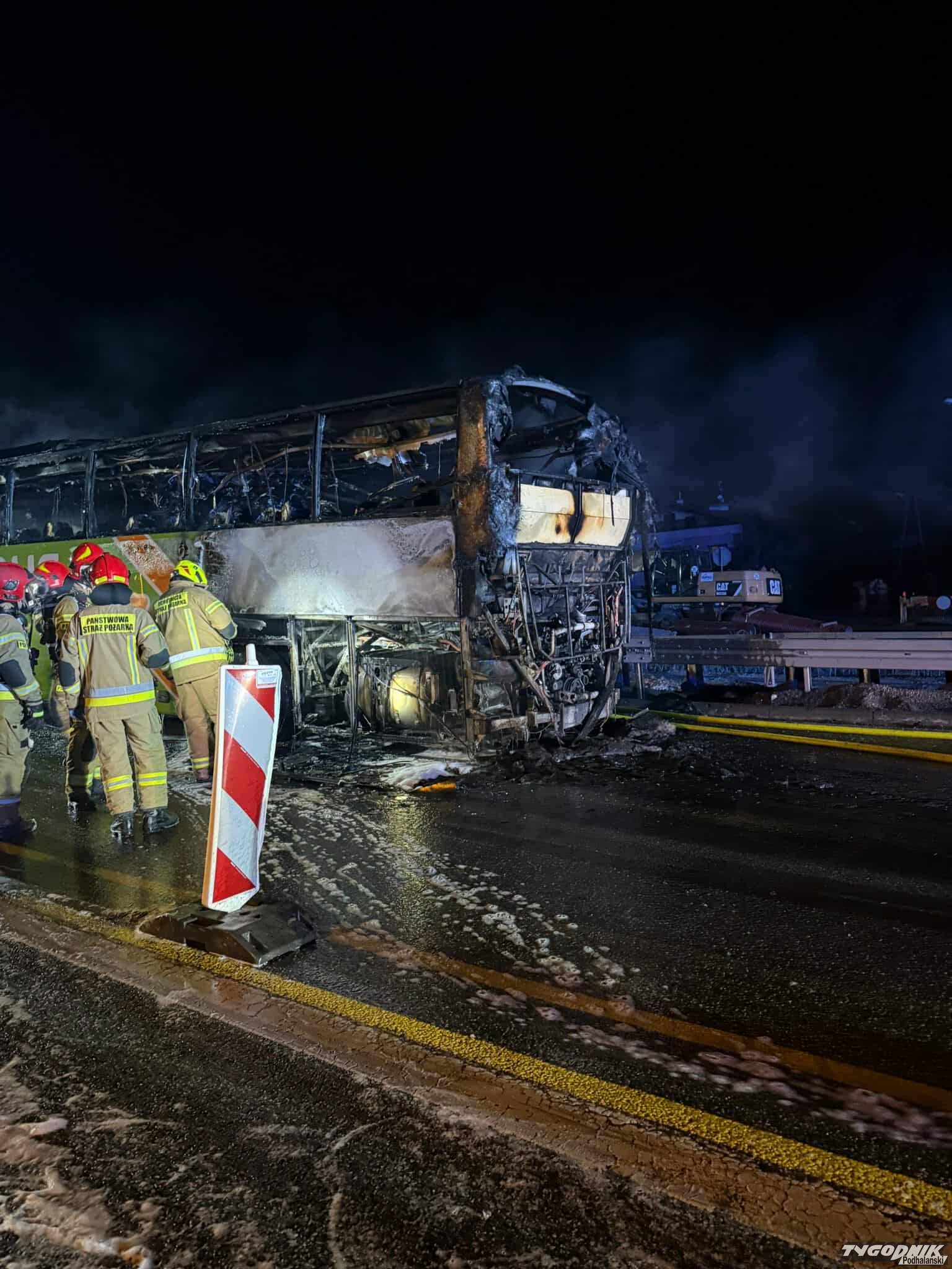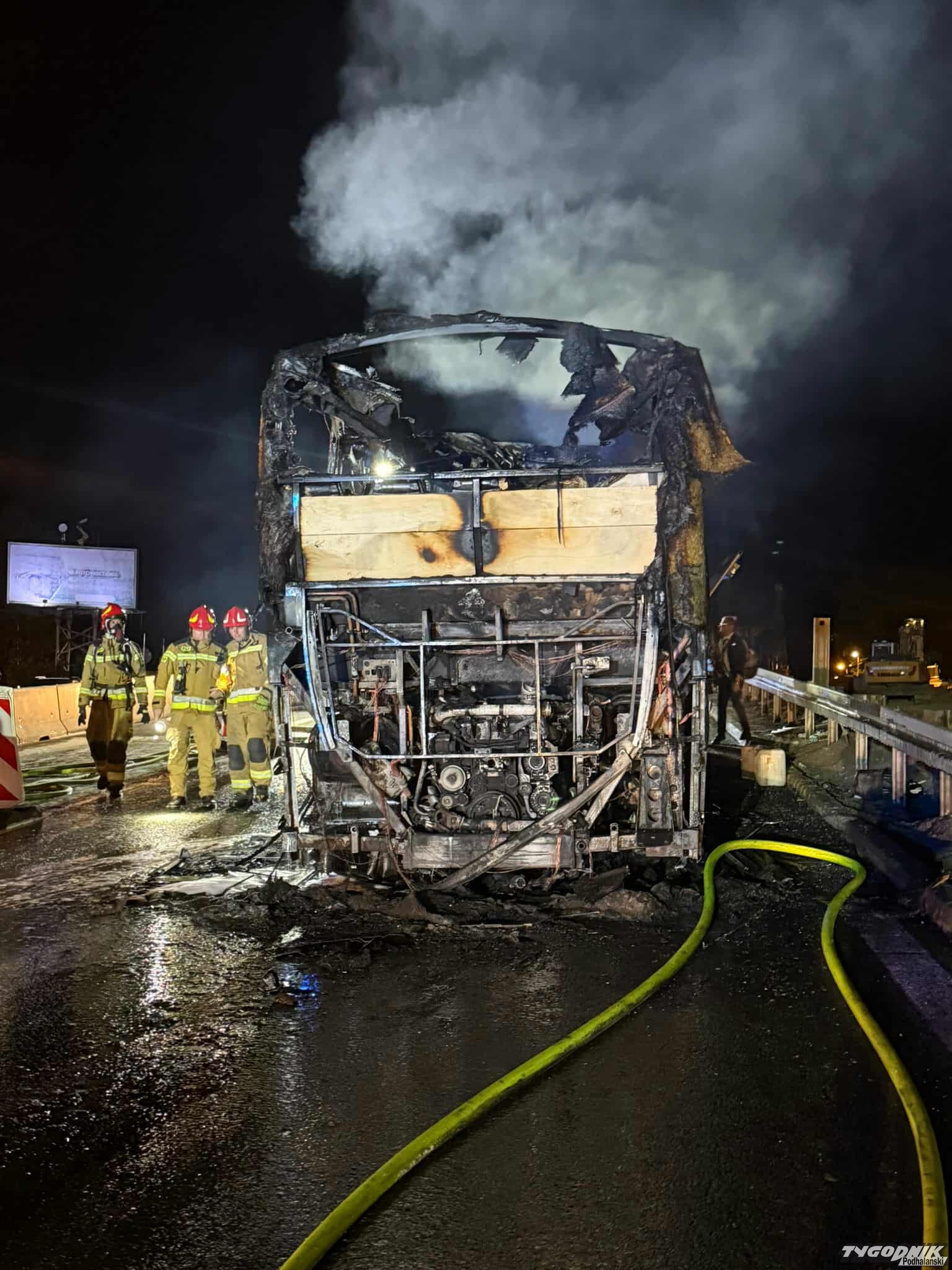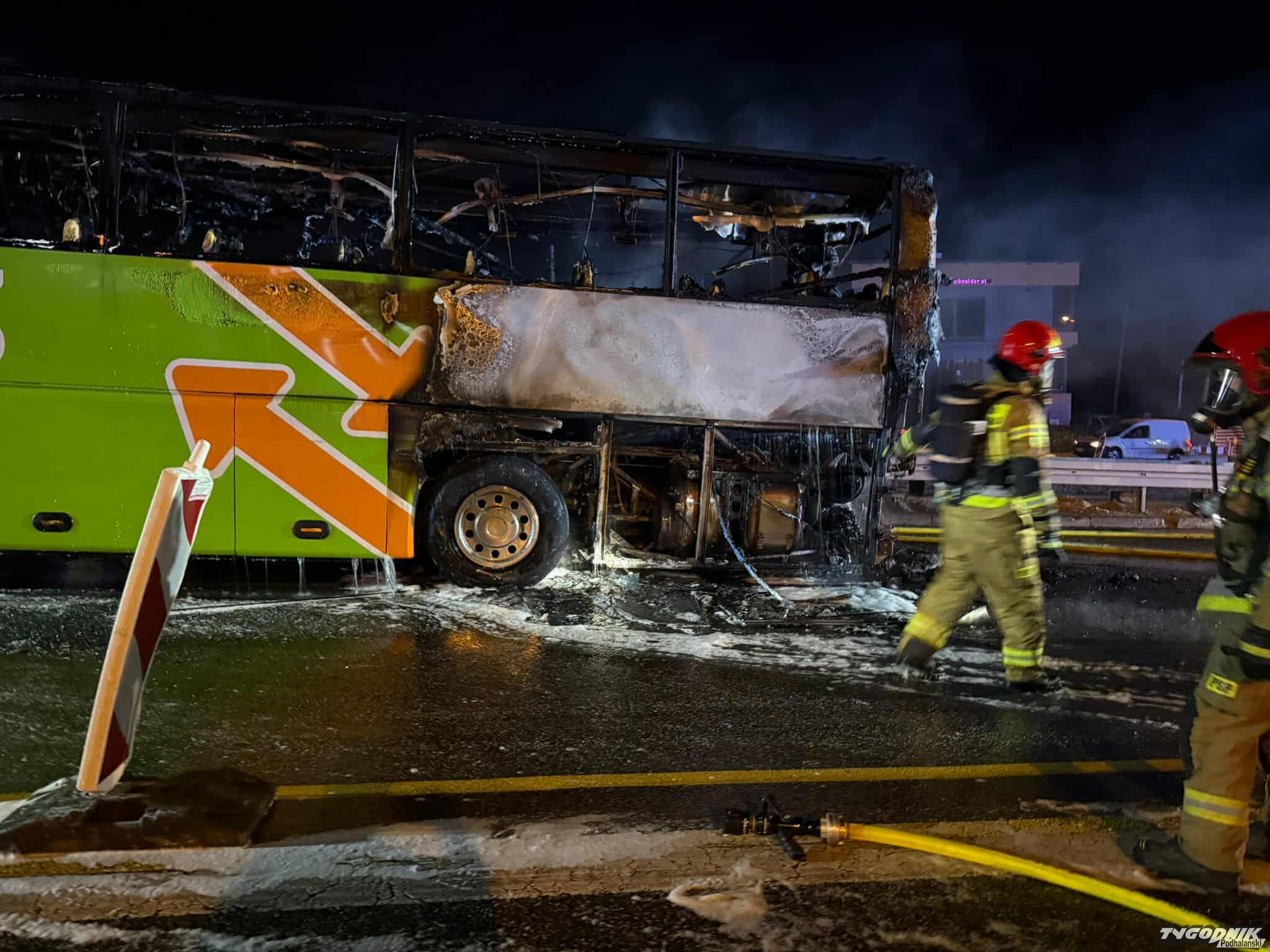 Pojazd niemal cały stanął w ogniu. Na miejsce natychmiast przybyli strażacy, którzy szybko ugasili pożar. W Libertowie szosa prowadząca w stronę Zakopanego jest całkowicie zablokowana. Autobusem podróżowało 41 osób. Nikomu nic się nie stało.