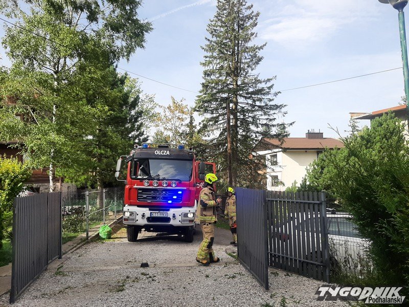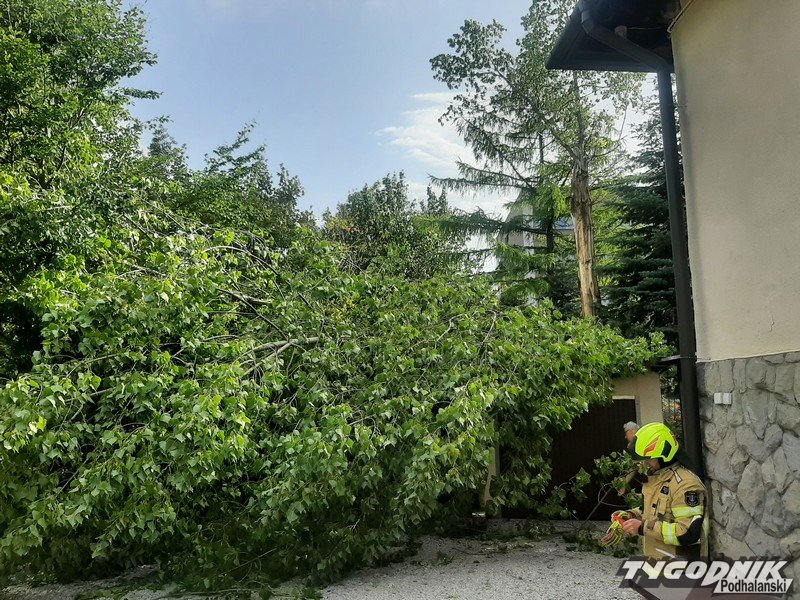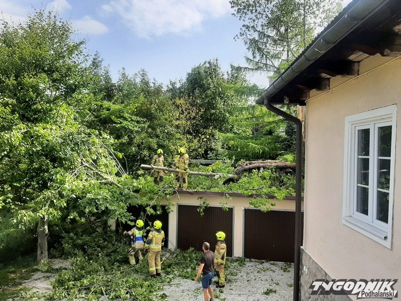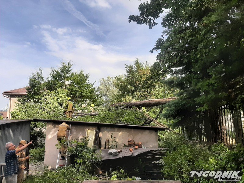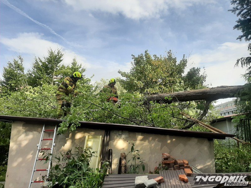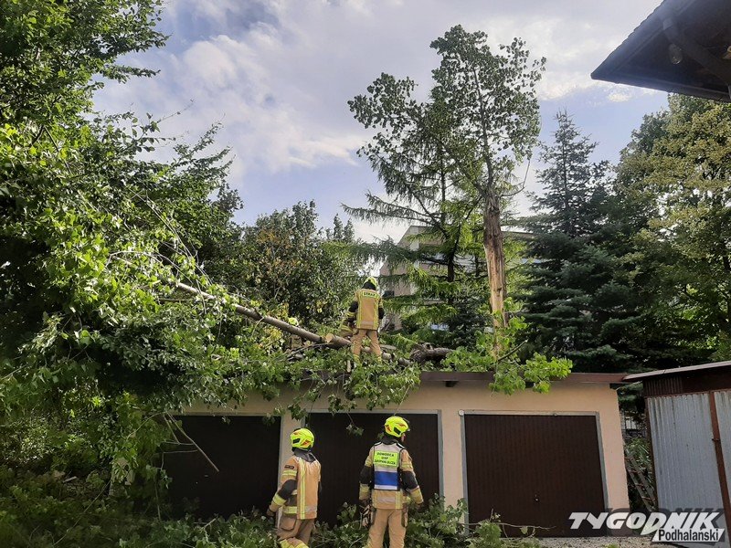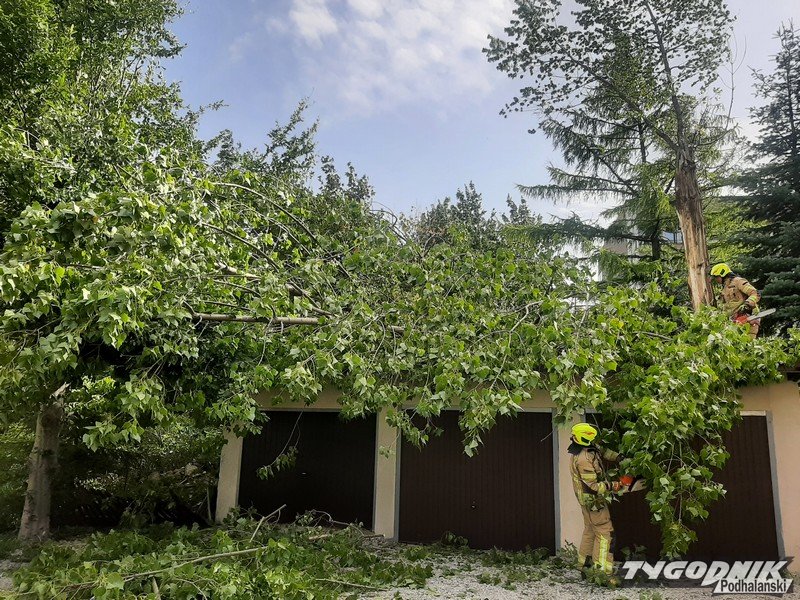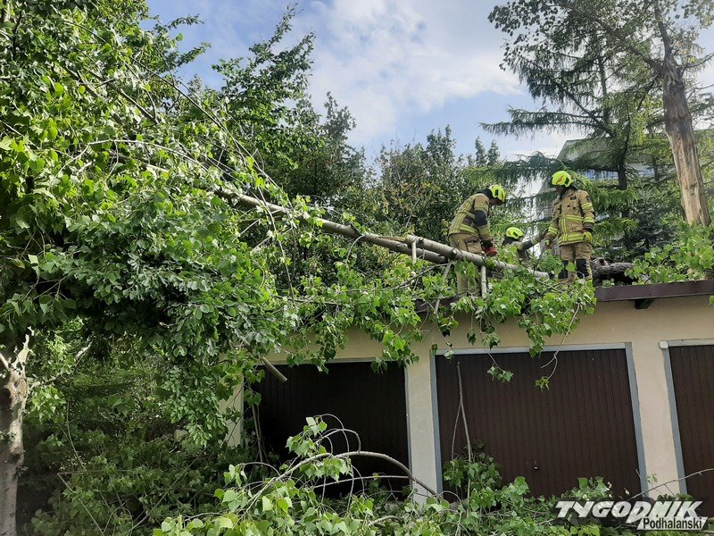 Strażacy są już na miejscu i usuwają zagrożenie, potężne drzewo pękło i ciężkie konary z fragmentem pnia runęły na garaże.