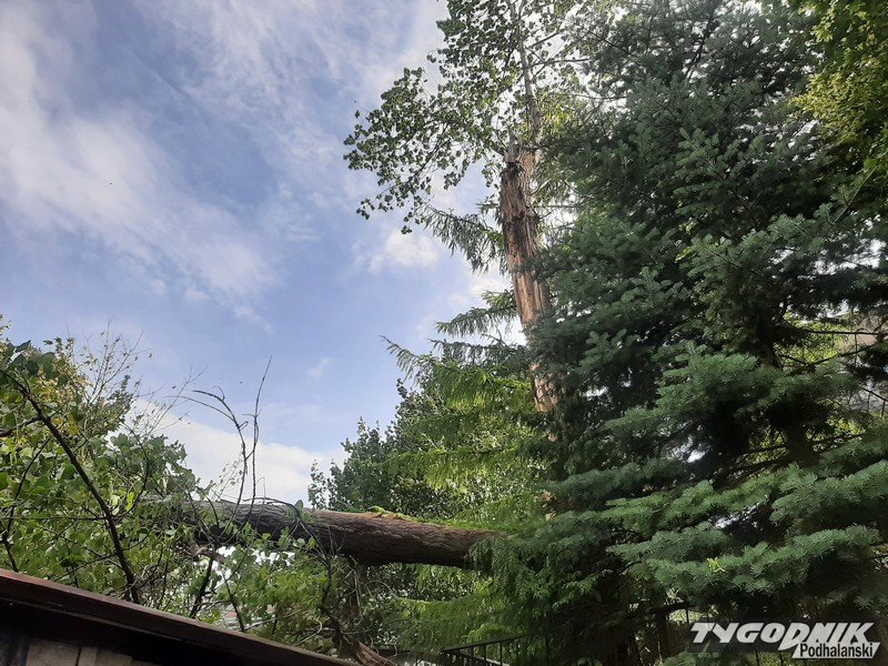 Potężne drzewo pękło pod naporem halnego i przywaliło garaże (WIDEO)