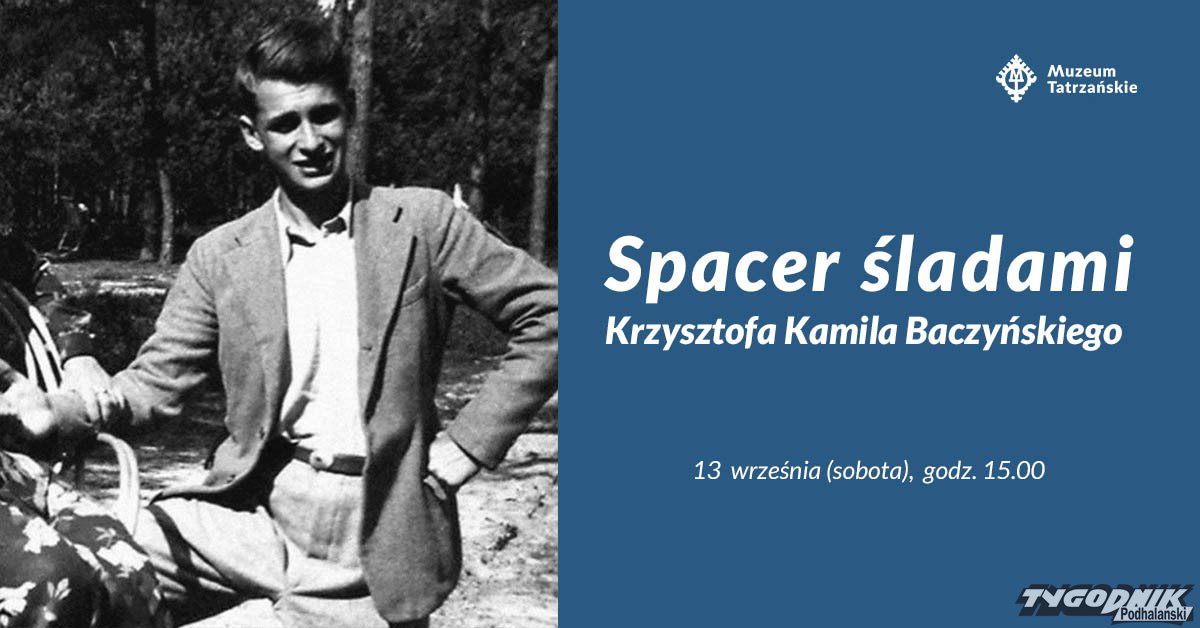 W sobotę 13.09 Muzeum Tatrzańskie zaprasza na spacer śladami Krzysztofa Kamila Baczyńskiego. Rozpocznie się on w Kuźnicach, gdzie w latach 1936-1937 Krzysztof Kamil Baczyński bywał na nartach z przyjaciółmi. Stamtąd trasa poprowadzi do pomnika dra Tytusa Chałubińskiego, przez Park Miejski do gmachu głównego. Kolejny przystanek będzie przy willi Bajka -pensjonacie, w którym gościł przed laty poeta. Całość spaceru dopełnią wybrane fragmenty wierszy Krzysztofa Kamila Baczyńskiego. Nie zabraknie także ciekawostek z jego życia, twórczości. Prowadzenie: Dominika Mąka. Start z Kuźnic, przy fontannie, o godzinie 15. Liczba miejsc ograniczona: 20 osób. Obowiązują zapisy pod adresem e-mail: wydarzenia@muzeumtatrzańskie.pl.