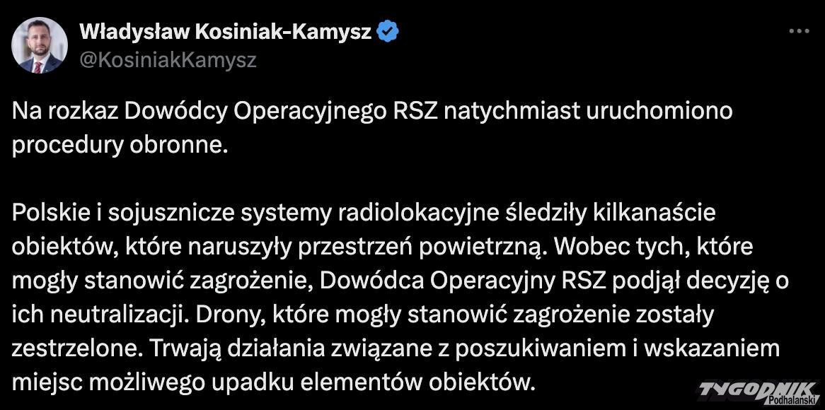 Z kolei Władysław Kosiniak Kamysz, minister obrony narodowej poinformował, że drony, które mogły stanowić zagrożenie zostały zestrzelone. Trwają poszukiwania zestrzelonych dronów. Jednego z nich odnaleziono w miejscowości Czosnówka pod Białą Podlaską w woj. lubelskim. Z kolei premier Donald Tusk na godz. 8 zwołał nadzwyczajne posiedzenie rządu.