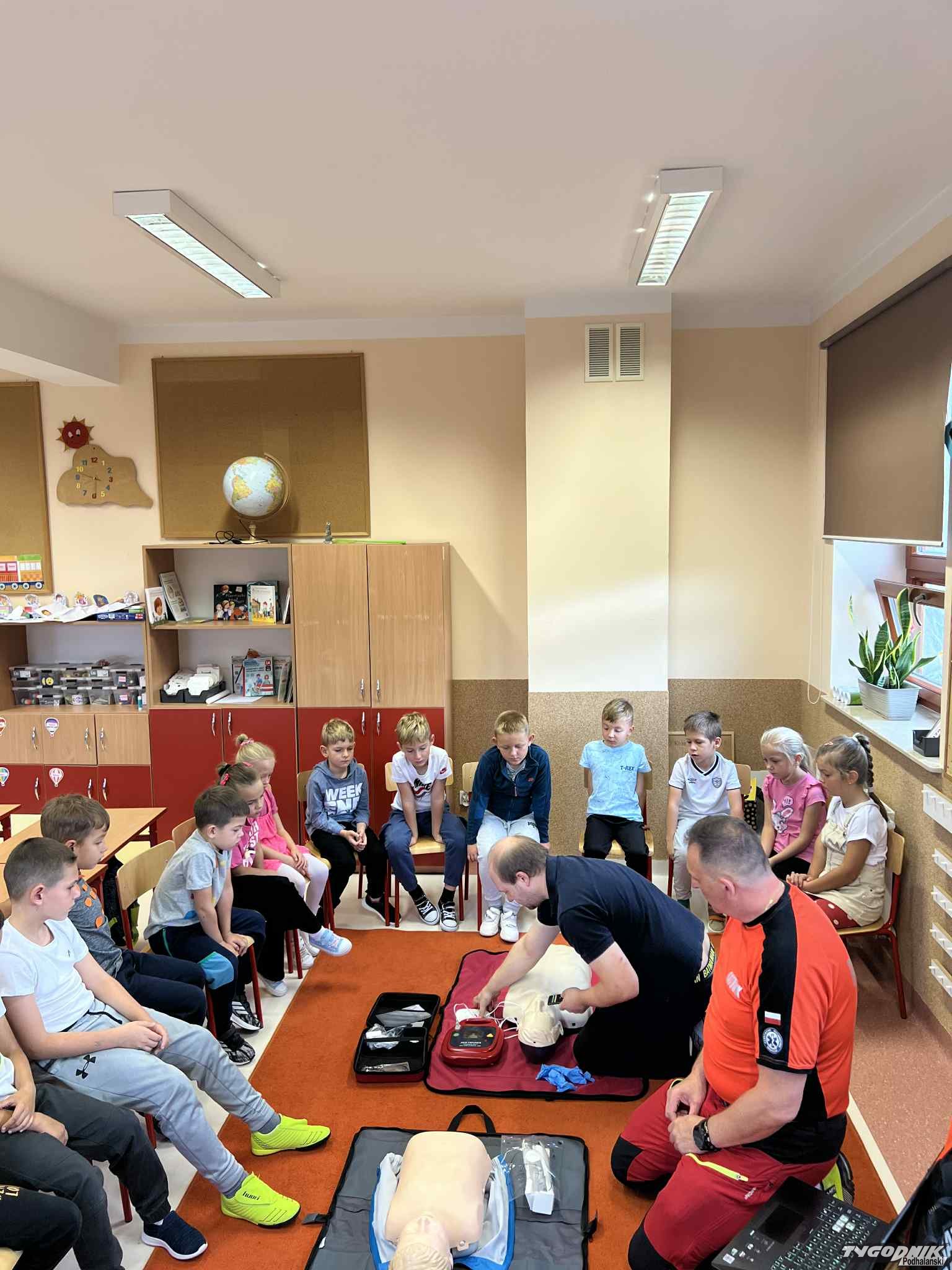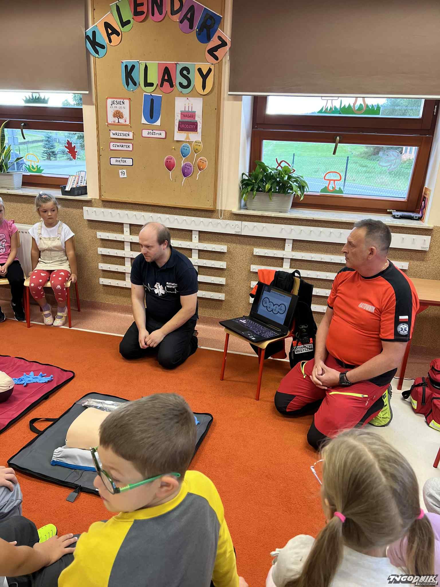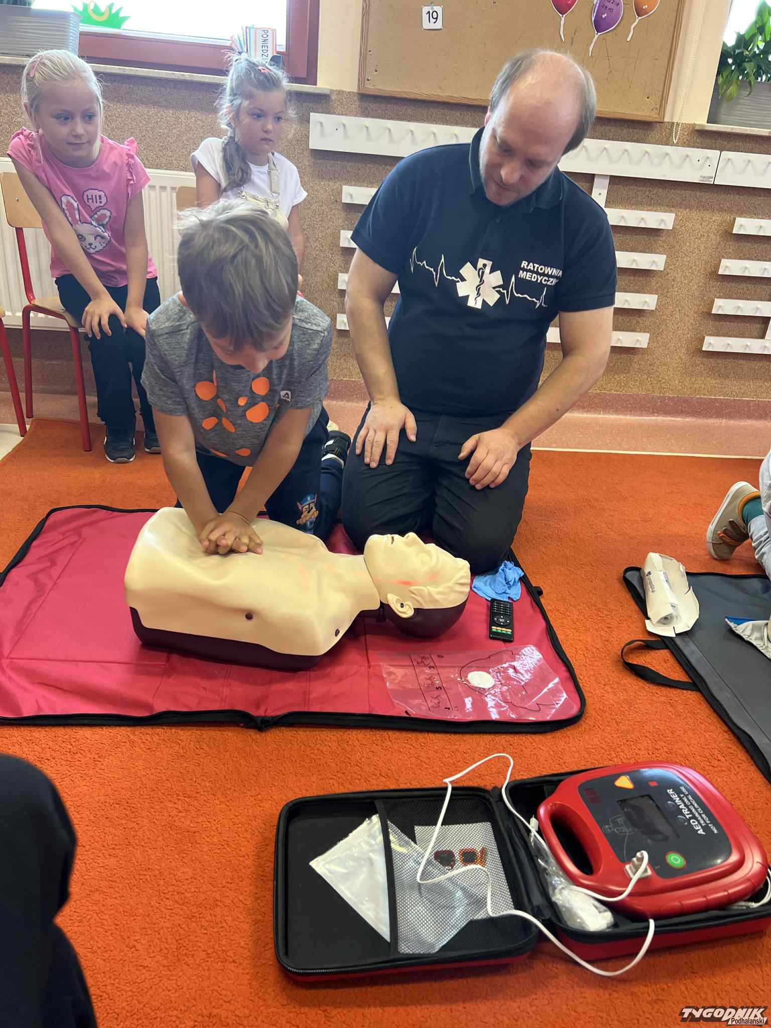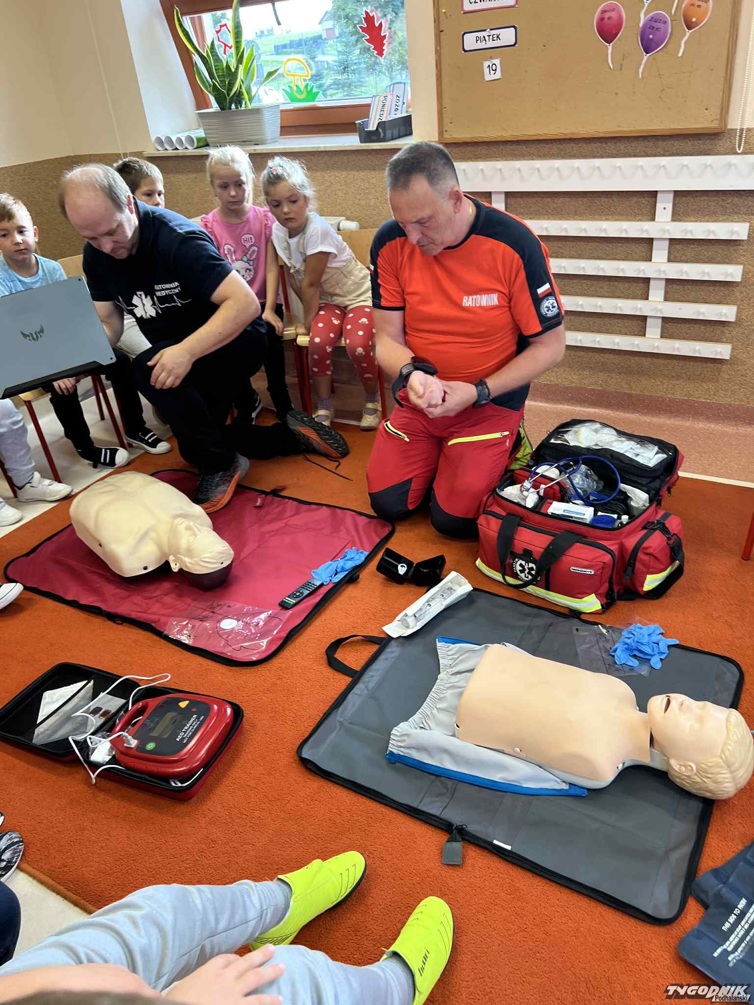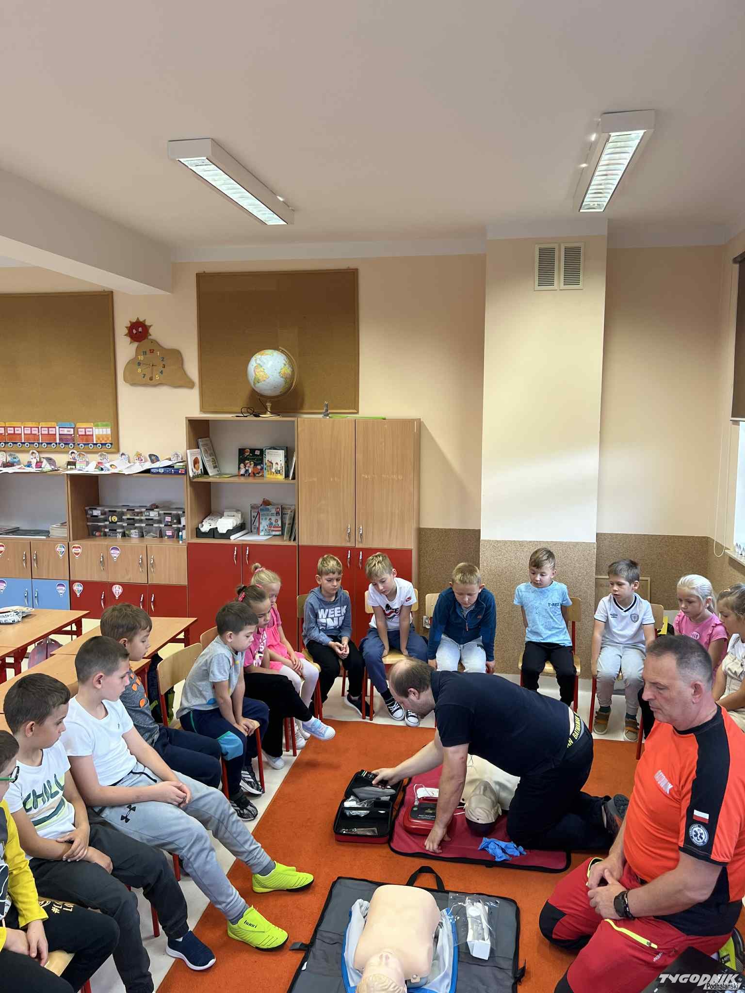 Uczniowie mogli zobaczyć z bliska wyposażenie kamizelki ratownika, niezbędną torbę ratowniczą oraz wnętrze karetki pogotowia. Ratownicy przeprowadzili również praktyczne szkolenie z zakresu pierwszej pomocy. Dzieci przypomniały sobie numery alarmowe, dowiedziały się, jak działa defibrylator, a także mogły spróbować własnych sił w prowadzeniu masażu serca. Na zakończenie każdy uczeń otrzymał pamiątkowy dyplom potwierdzający udział w szkoleniu. Było to niezwykle pouczające i ciekawe spotkanie, które na długo pozostanie w pamięci pierwszoklasistów.