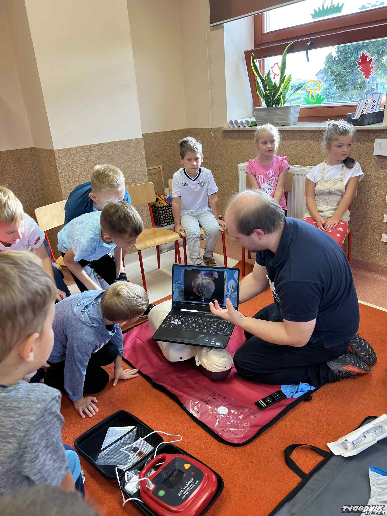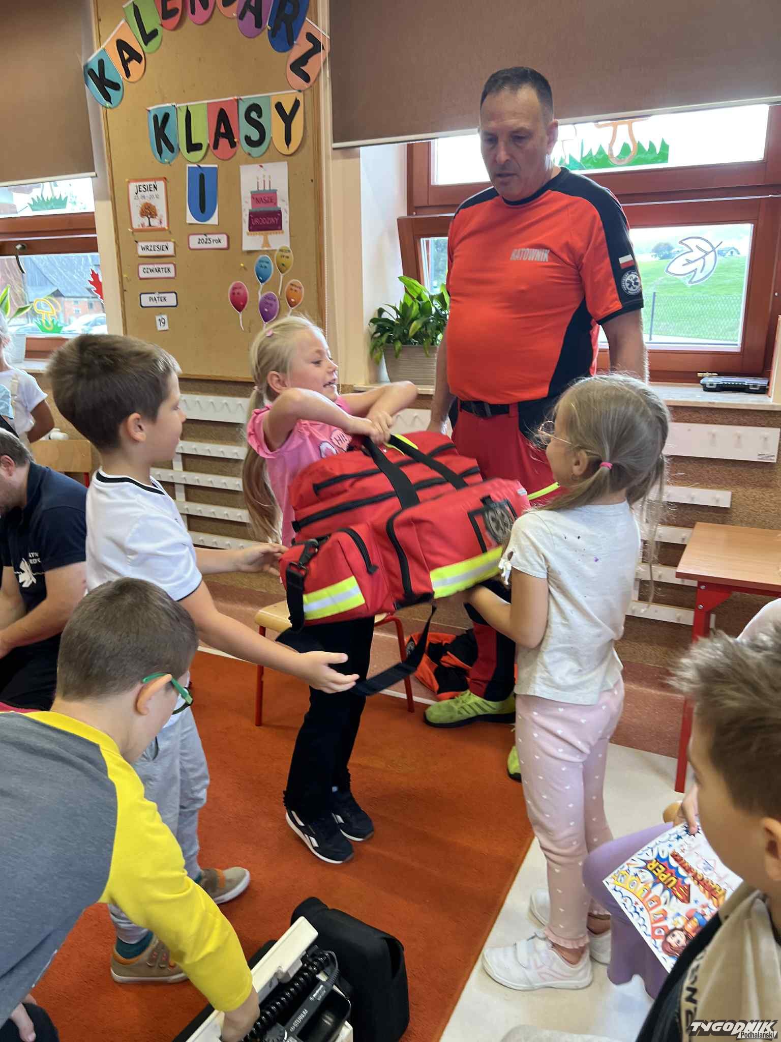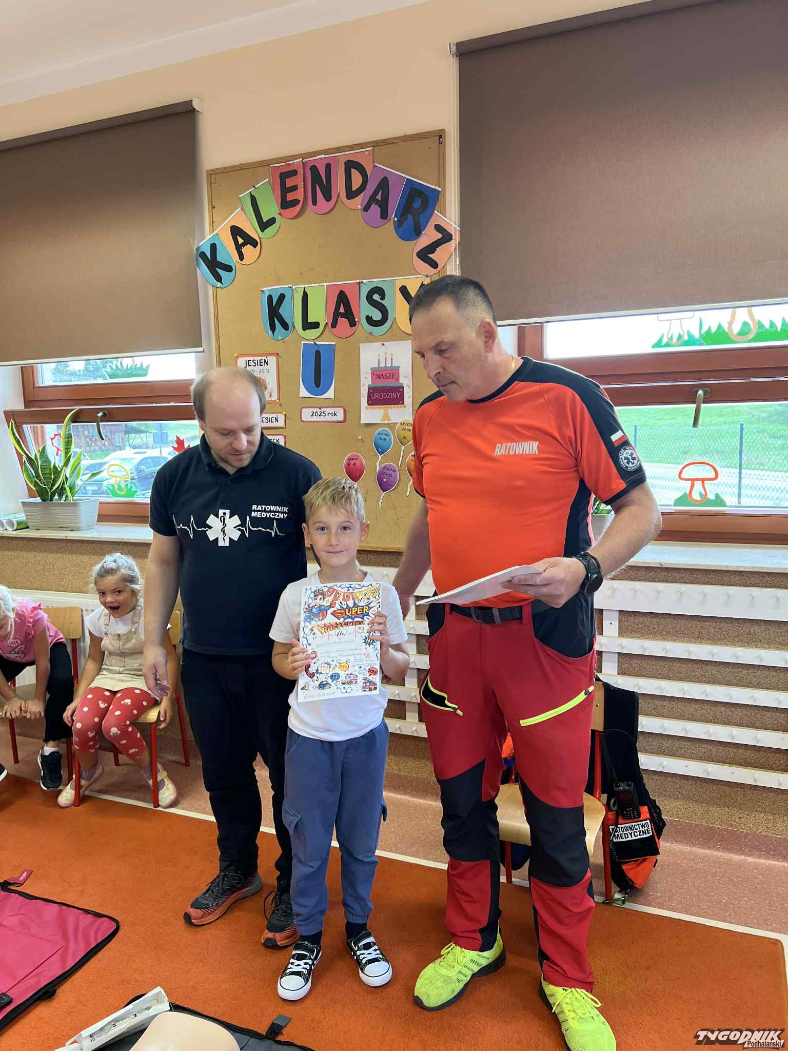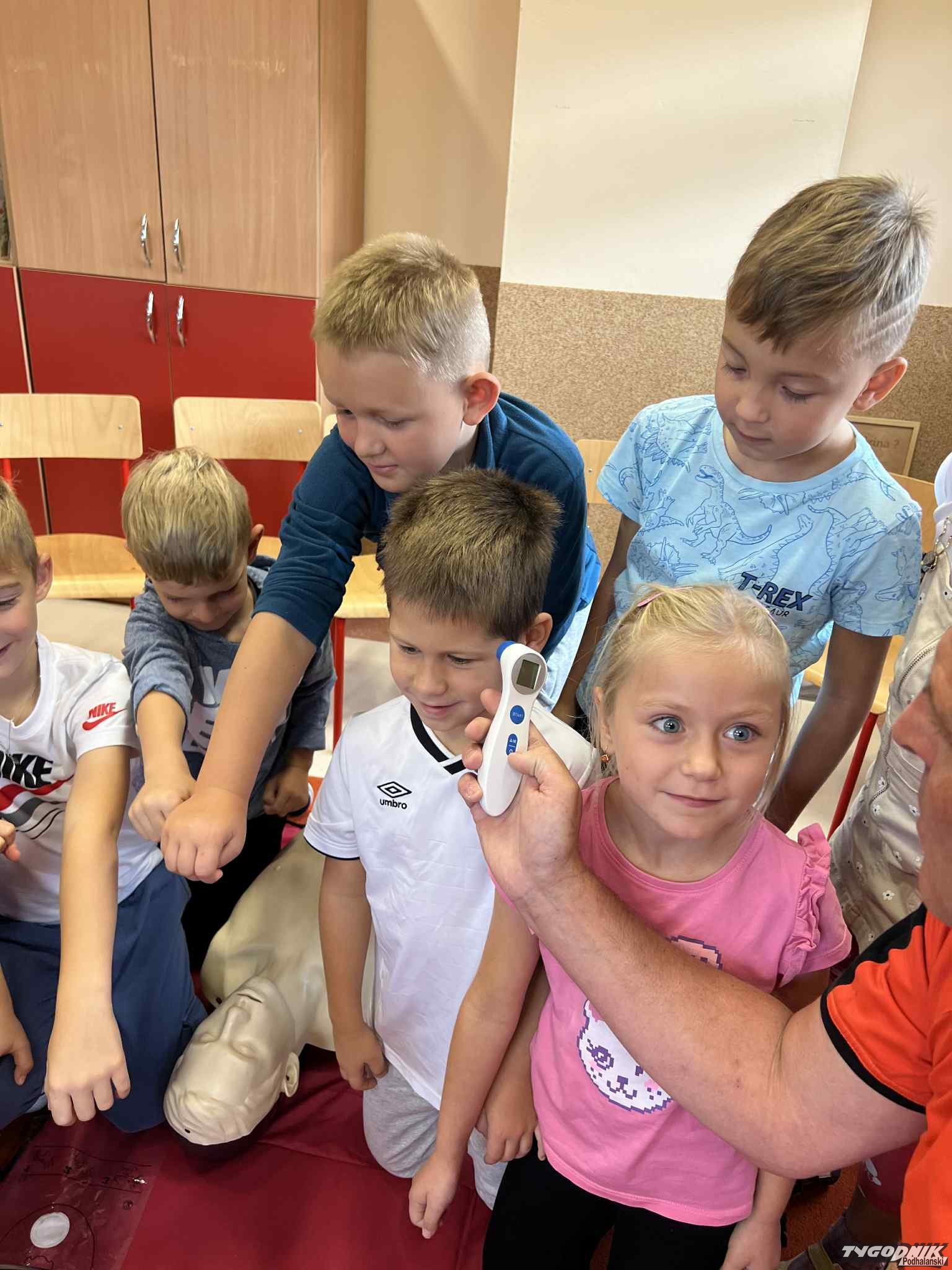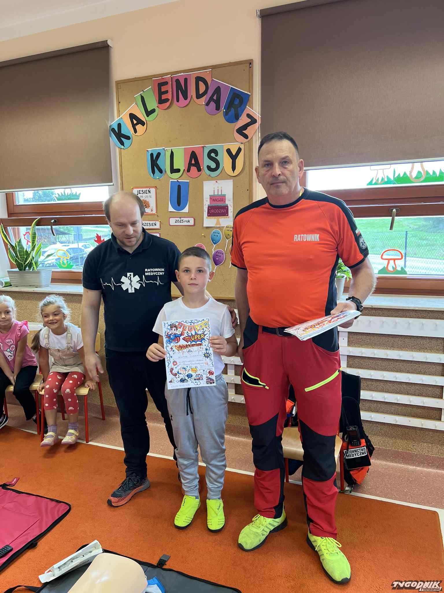 Uczniowie mogli zobaczyć z bliska wyposażenie kamizelki ratownika, niezbędną torbę ratowniczą oraz wnętrze karetki pogotowia. Ratownicy przeprowadzili również praktyczne szkolenie z zakresu pierwszej pomocy. Dzieci przypomniały sobie numery alarmowe, dowiedziały się, jak działa defibrylator, a także mogły spróbować własnych sił w prowadzeniu masażu serca. Na zakończenie każdy uczeń otrzymał pamiątkowy dyplom potwierdzający udział w szkoleniu. Było to niezwykle pouczające i ciekawe spotkanie, które na długo pozostanie w pamięci pierwszoklasistów.