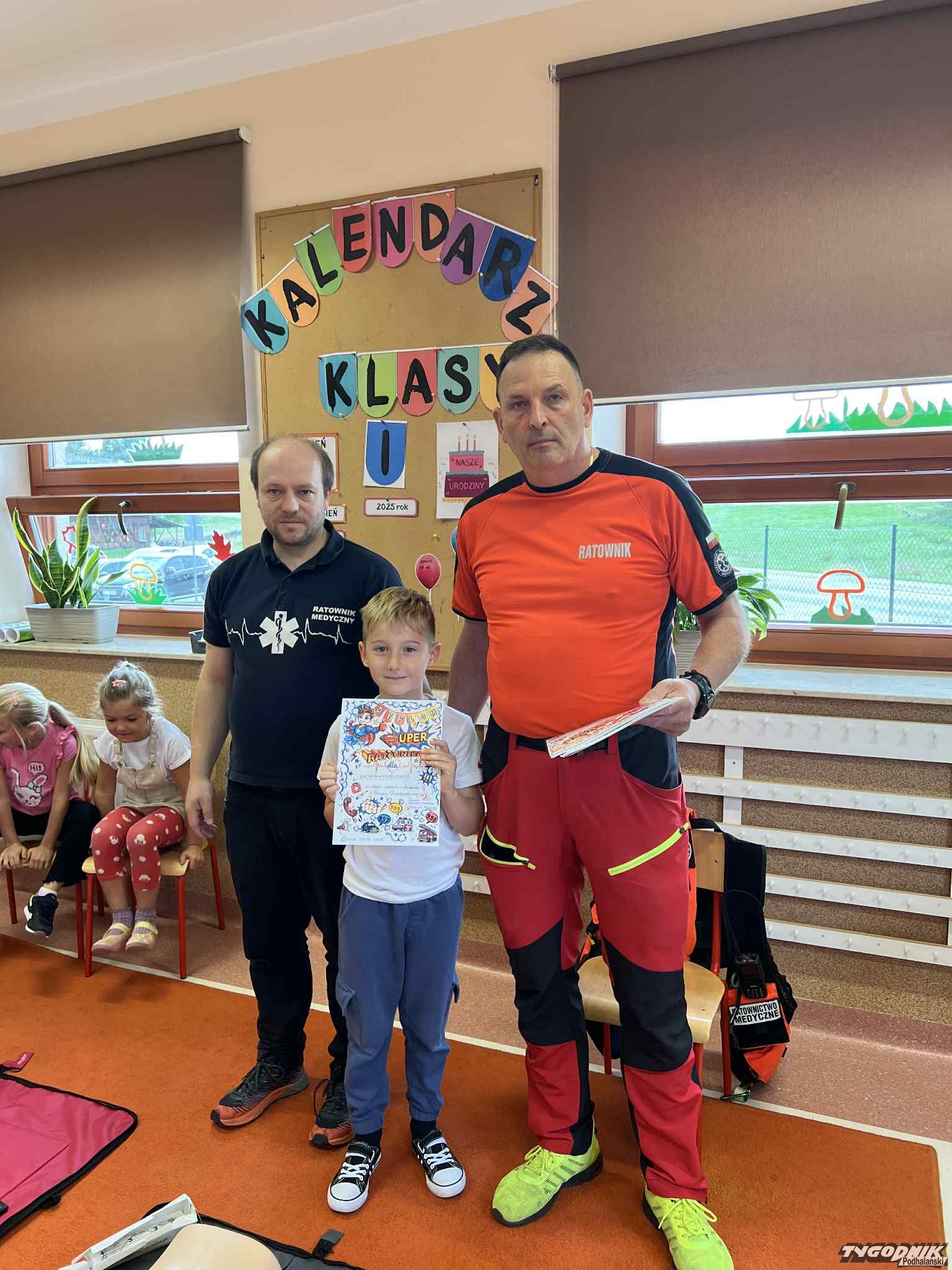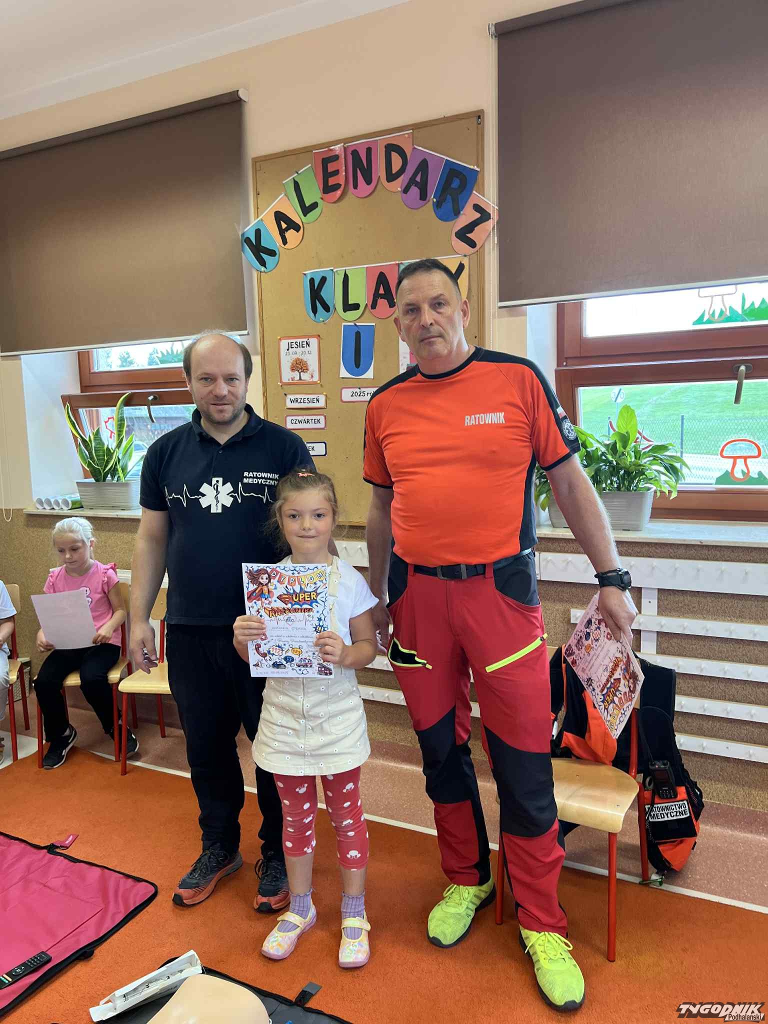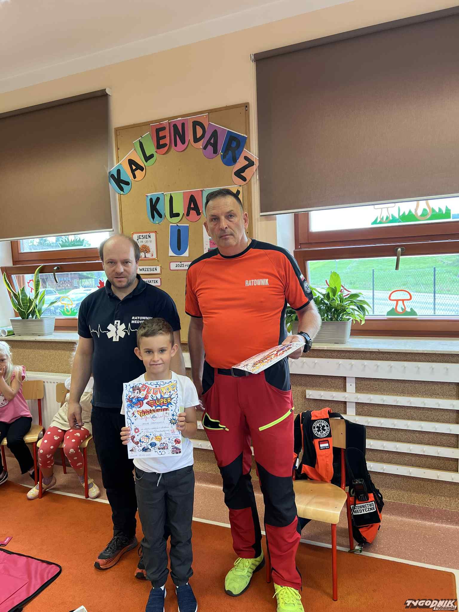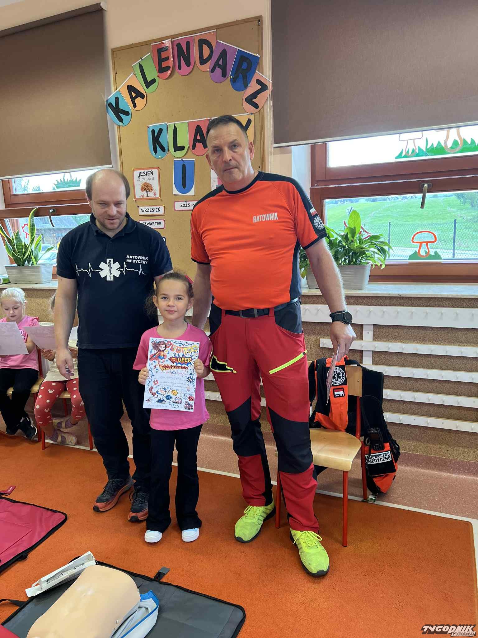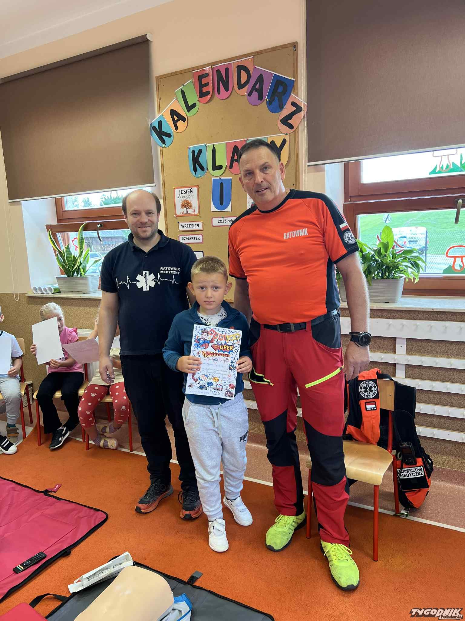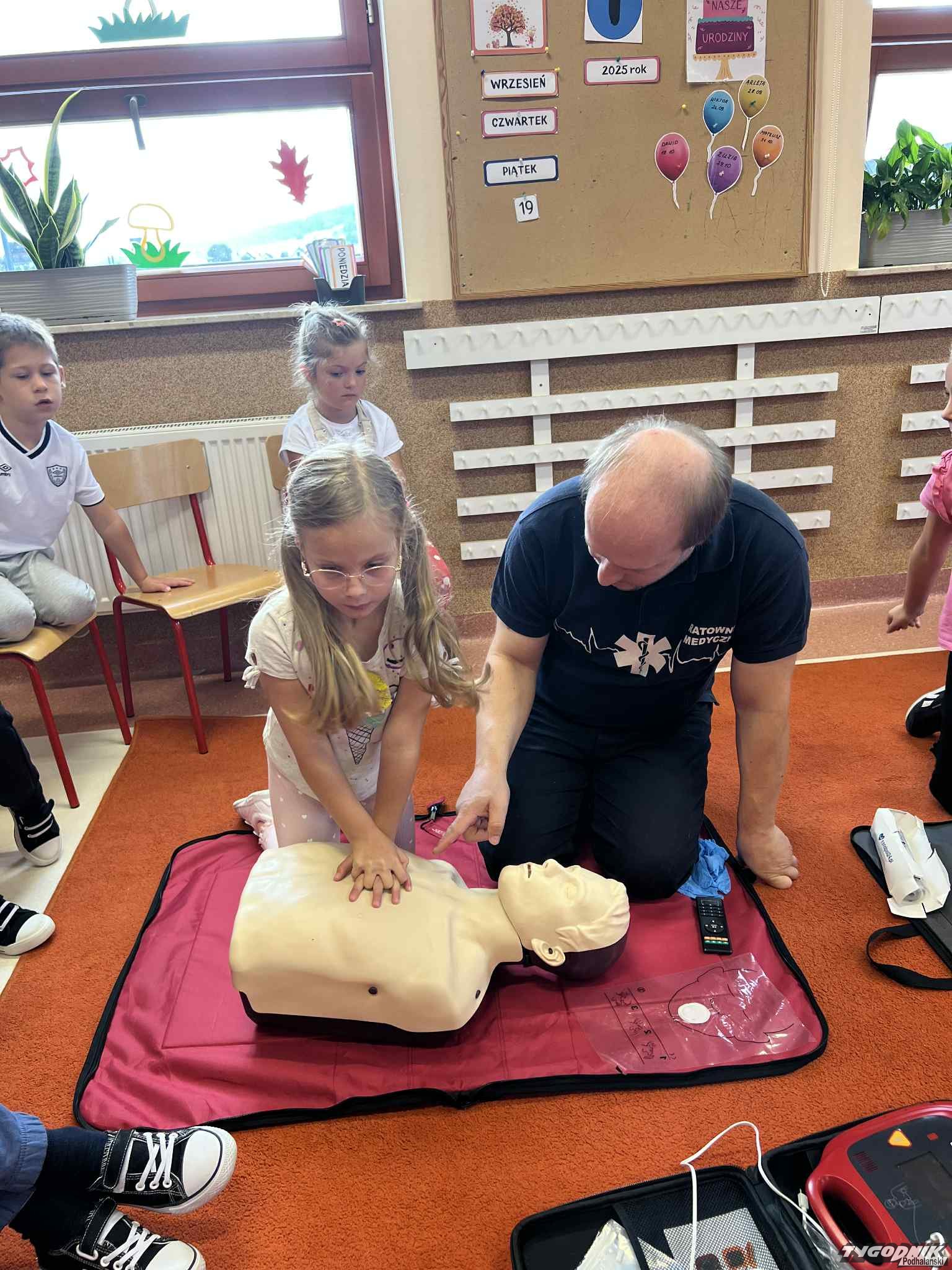 Uczniowie mogli zobaczyć z bliska wyposażenie kamizelki ratownika, niezbędną torbę ratowniczą oraz wnętrze karetki pogotowia. Ratownicy przeprowadzili również praktyczne szkolenie z zakresu pierwszej pomocy. Dzieci przypomniały sobie numery alarmowe, dowiedziały się, jak działa defibrylator, a także mogły spróbować własnych sił w prowadzeniu masażu serca. Na zakończenie każdy uczeń otrzymał pamiątkowy dyplom potwierdzający udział w szkoleniu. Było to niezwykle pouczające i ciekawe spotkanie, które na długo pozostanie w pamięci pierwszoklasistów.