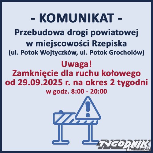 Od poniedziałku, 29 września w Rzepiskach droga będzie nieprzejezdna.