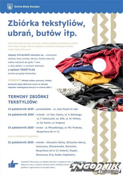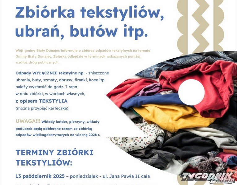 W Białym Dunajcu szykuje się październikowa akcja Tekstylia, mieszkańcy gminy oddać będą mogli zużyte ubrania, szmaty, obrusy, firanki, koce i inne tekstylia.