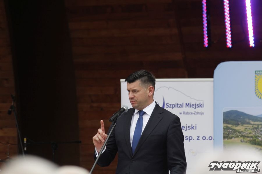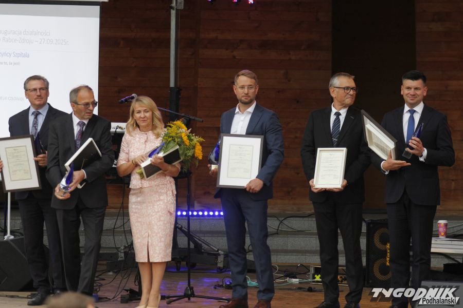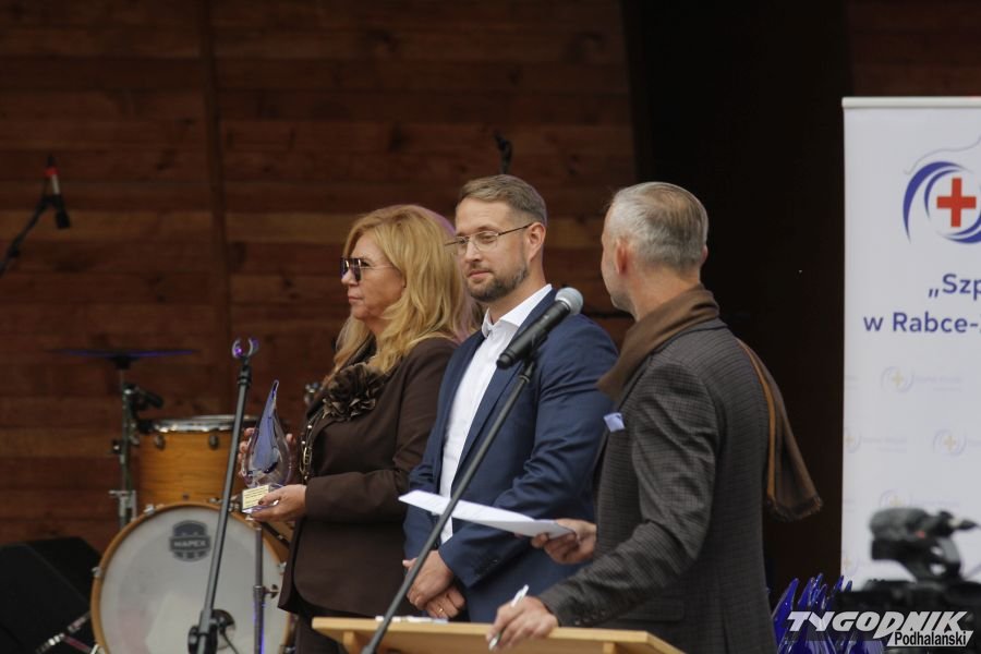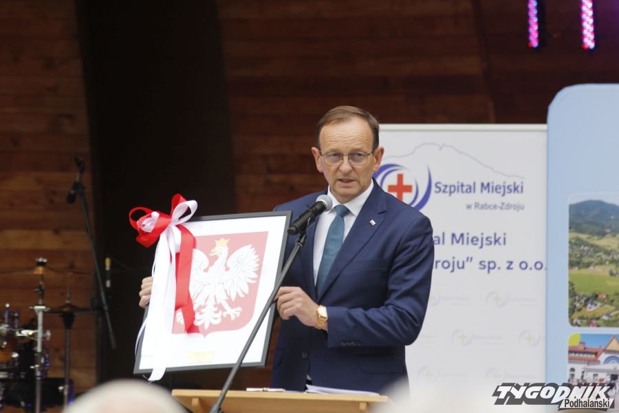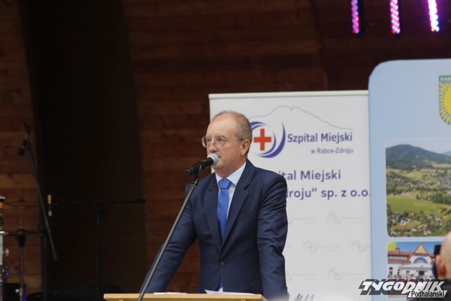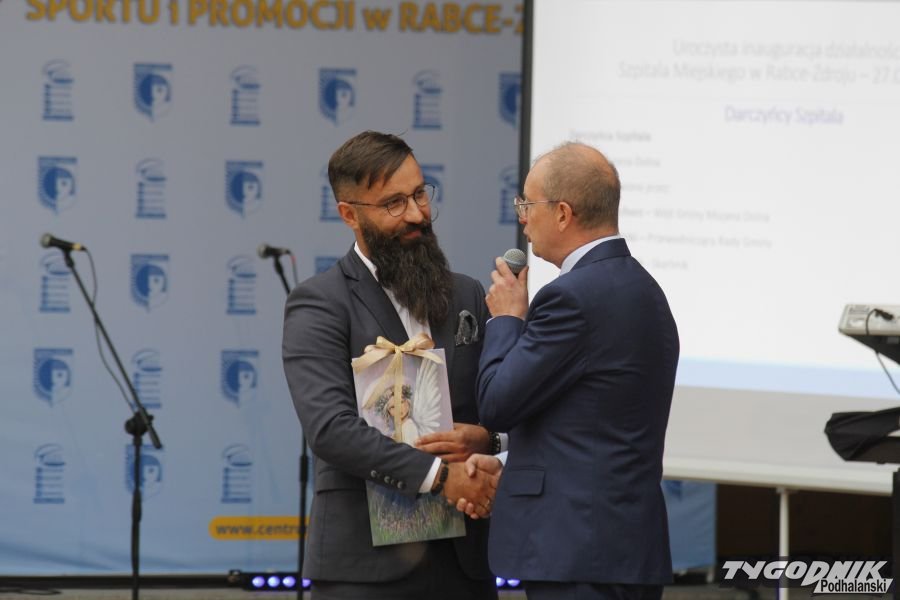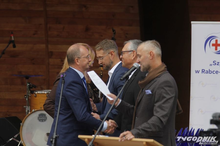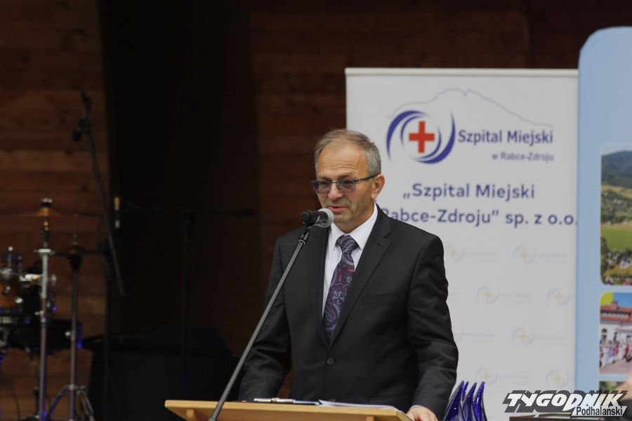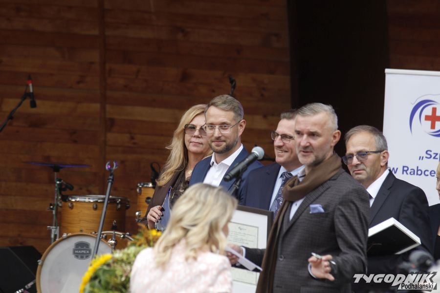 Pierwsza część uroczystości odbyła się na placu przed gmachem odbudowanego szpitala. Tam nastąpiło symboliczne przecięcie wstęgi i poświecenie nowego budynku. Spod szpitala, goście uroczystości przy akompaniamencie Orkiestry Dętej Rabczańskiej OSP przemaszerowali do amfiteatru. Tam nastąpiło uroczyste powitanie gości i przyszedł czas na przemówienia.
