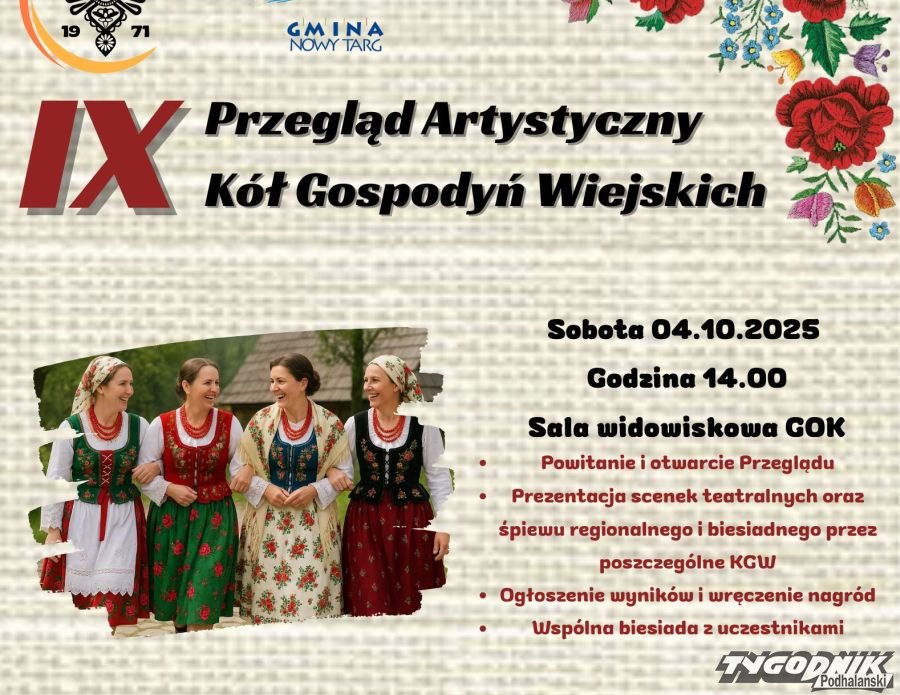 Zapraszamy na Przegląd Artystyczny Kół Gospodyń Wiejskich, który odbędzie się w sobotę 4.10 w Gminnym Ośrodku Kultury w Łopusznej.