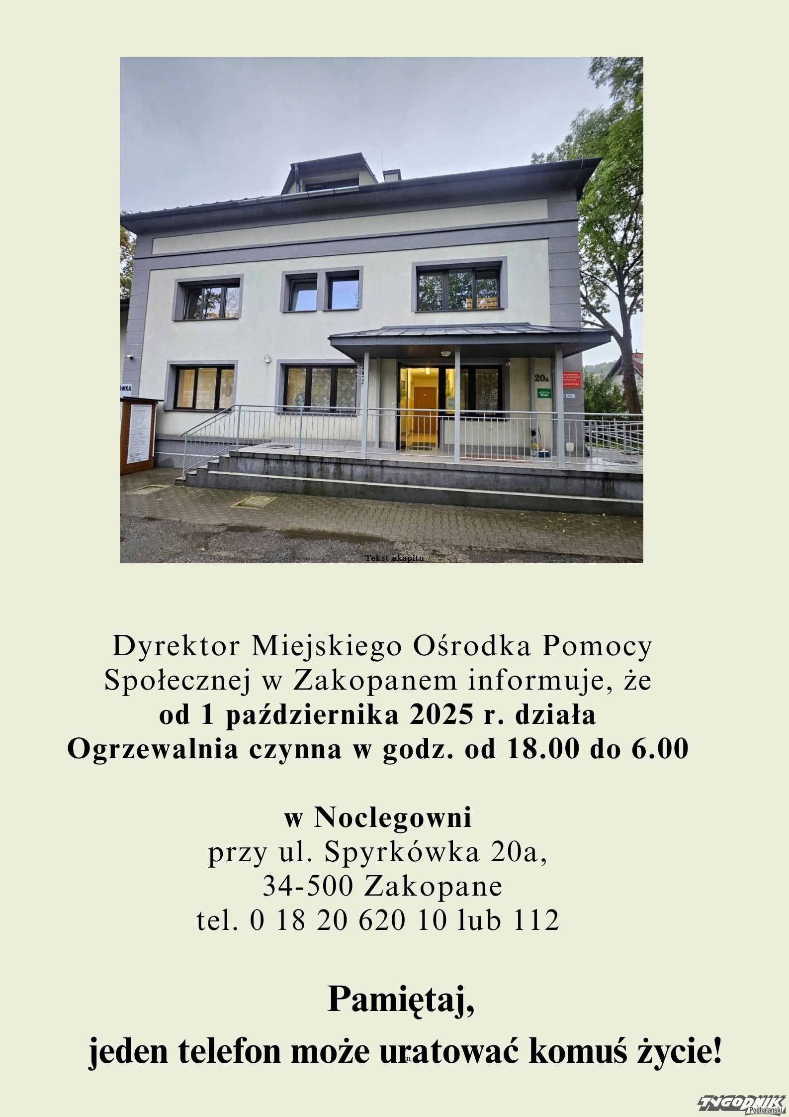 Od 1 października w Zakopanem działa "Ogrzewalnia ", która czynna jest w godz. 18:00-6:00. Znajduje się w Noclegowni przy ul. Spyrkówka 20A w Zakopanem, tel. (18) 20 620 10.