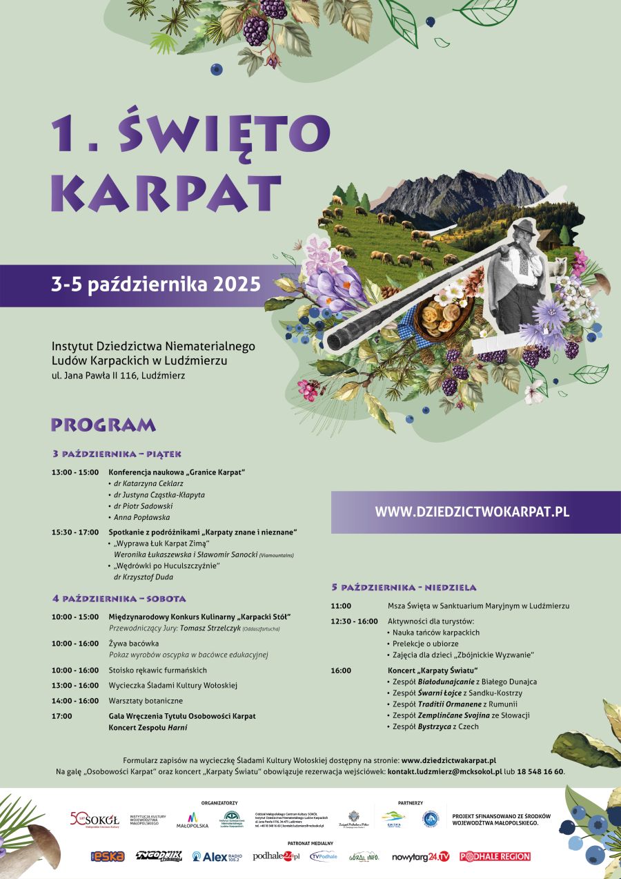 Z tej okazji zapraszamy od 3 do 5 października na teren Instytutu Dziedzictwa Niematerialnego Ludów Karpackich w Ludźmierzu - oddział MCK SOKóŁ. Program Święta Karpat na plakacie niżej.