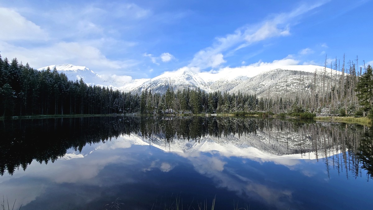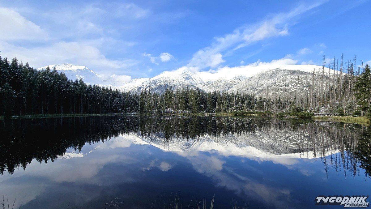 Lekki mróz, ośnieżone szczyty odbijające się w tafli stawu, cisza i spokój. Tak dziś o godz. 8 było nad Smreczyńskim Stawem.