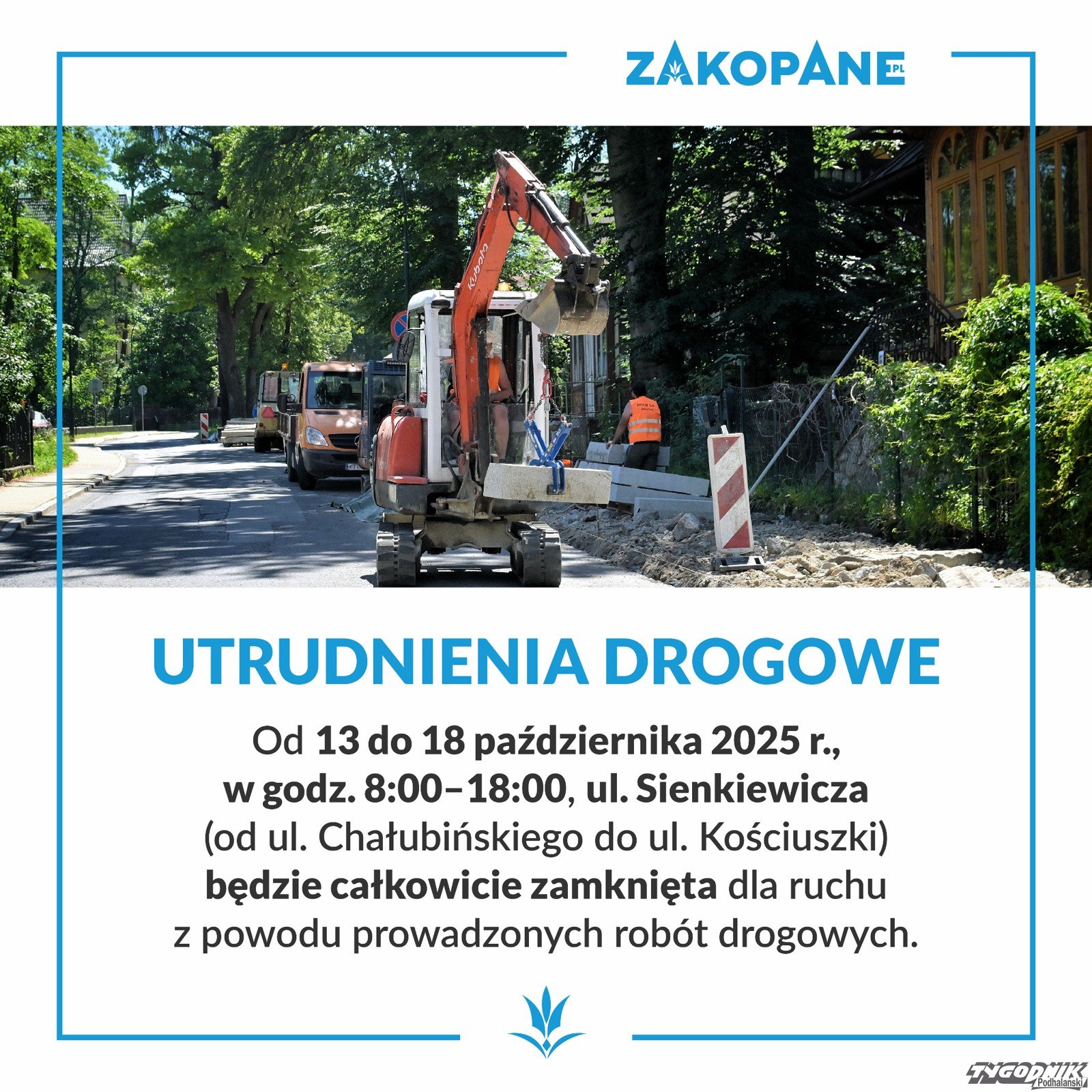 Remontowana ulica Sienkiewicza w Zakopanem zostanie na sześć dni całkowicie zamknięta dla ruchu kołowego.