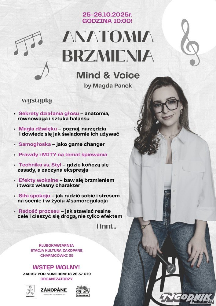 Jak znaleźć balans między techniką a emocją, jak mówić i śpiewać bez napięcia i utraty głosu, jak brzmieć autentycznie - po prostu po swojemu? Warsztaty Anatomia Brzmienia to wyjątkowe spotkanie dla wokalistów na każdym poziomie zaawansowania - zarówno tych, którzy dopiero zaczynają swoją przygodę ze śpiewem, jak i profesjonalistów chcących rozwinąć świadomość głosu i ekspresję sceniczną.