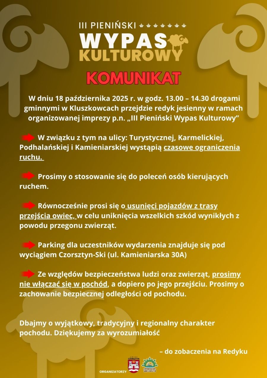 Niżej trasa przejścia owiec ulicami Kluszkowiec, komunikat organizatorów i szczegółowy program.
