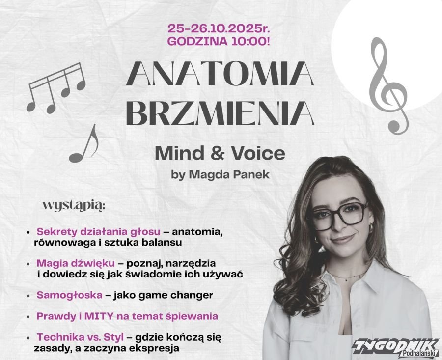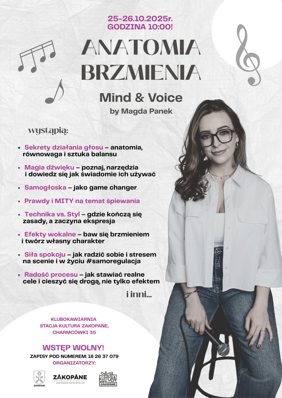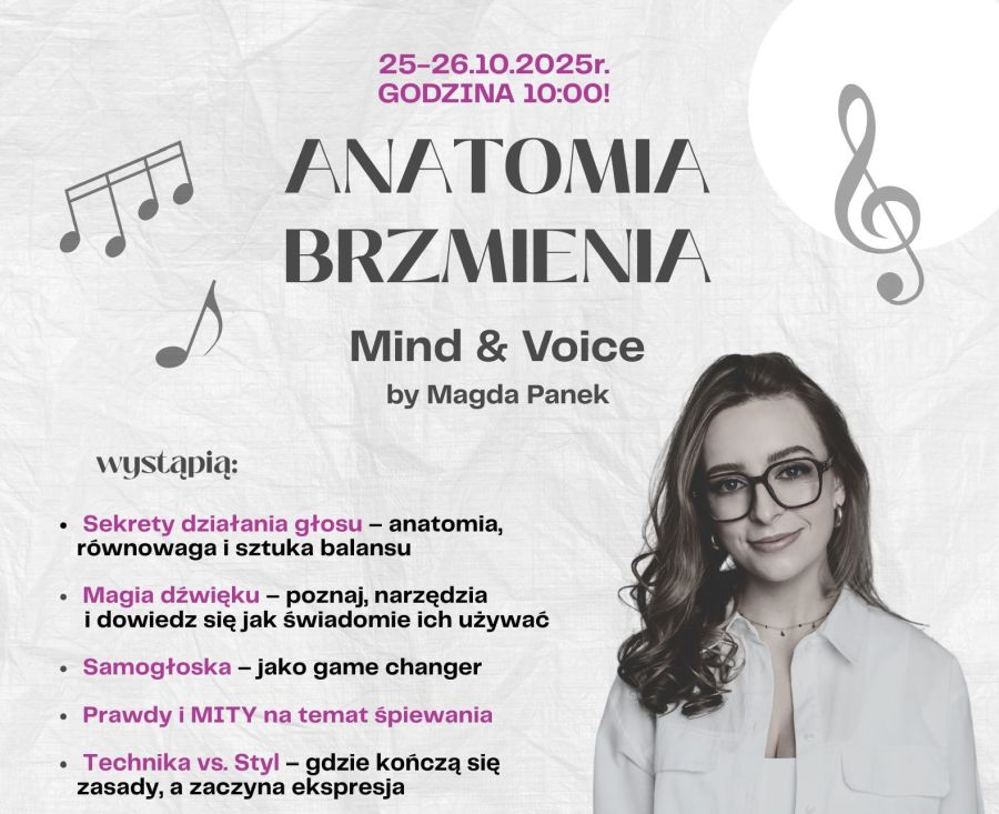 Warsztaty „Anatomia brzmienia” to wyjątkowe spotkanie dla wokalistów na każdym poziomie zaawansowania – zarówno tych, którzy dopiero zaczynają swoją przygodę ze śpiewem, jak i profesjonalistów chcących rozwinąć świadomość głosu i ekspresję sceniczną. Jak zapewniają organizatorzy: „Podczas dwóch dni skupimy się na tym, by zrozumieć, poczuć i uwolnić Twój głos – od strony fizycznej, emocjonalnej i psychologicznej. To będzie połączenie wiedzy, praktyki i doświadczenia, które pozwoli Ci świadomie pracować ze swoim instrumentem i zrozumieć, jak głos działa - i to bez KITU. Dowiemy się, czym tak naprawdę jest ten cały balans, jak funkcjonuje nasz aparat głosowy, o co chodzi z tą całą emisją głosu i jak wreszcie przestać toczyć odwieczne zapasy z ulubionymi utworami. Obalimy mity, odkryjemy prawdy o głosie oraz poznamy anatomię, konkretne narzędzia, które pomogą Ci śpiewać lepiej, zdrowiej i z większą swobodą”.