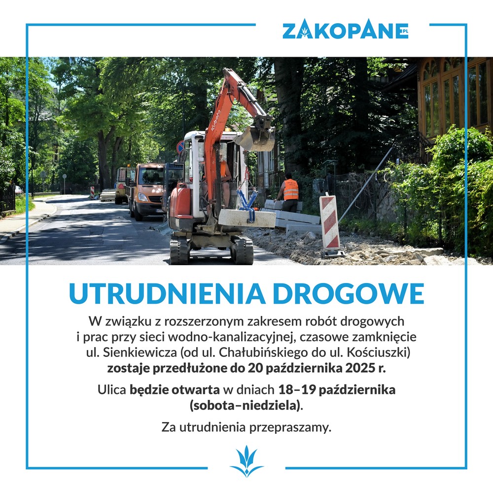 Komunikat zakopiańskiego Urzędu Miasta: "Z uwagi na zwiększony zakres robót związanych z wykonaniem przyłączy do sieci kanalizacji sanitarnej i wodociągowej, czasowe zamknięcie ul. Sienkiewicza (od ul. Chałubińskiego do ul. Kościuszki) zostaje przedłużone do 20.10.2025r. Okres zamknięcia drogi gminnej nie obejmuje dni 18-19.10.2025r. (sobota-niedziela). Za utrudnienia przepraszamy i dziękujemy za wyrozumiałość."