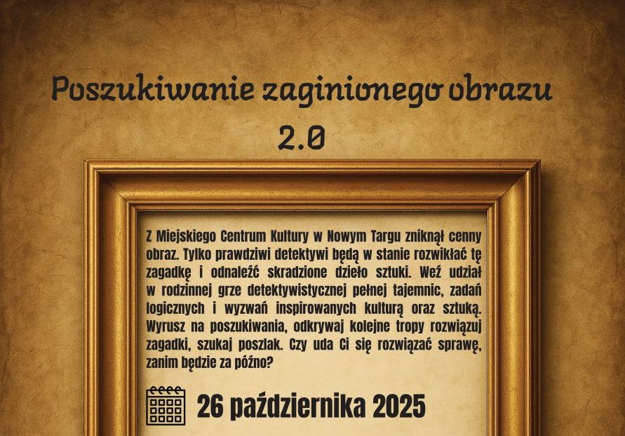 W niedzielę 26.10 zapraszamy do udziału w detektywistycznej rodzinnej grze miejskiej "Poszukiwanie zaginionego obrazu 2.0" oraz Gali 10-lecia Gier Miejskich w Nowym Targu.