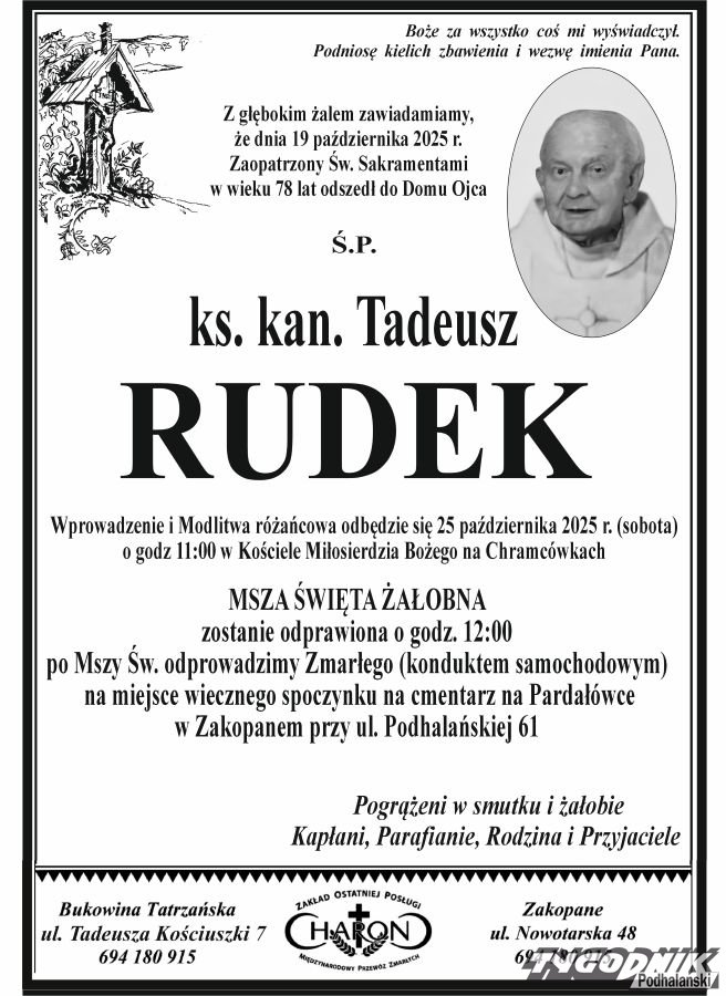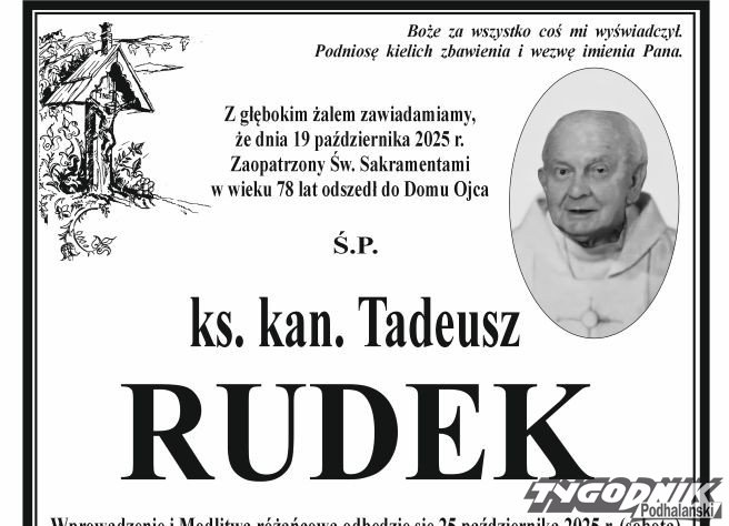 W wieku 78 lat zmarł ksiądz kanonik Tadeusz Rudek, służbie kapłańskiej poświęcił ponad pięćdziesiąt lat.