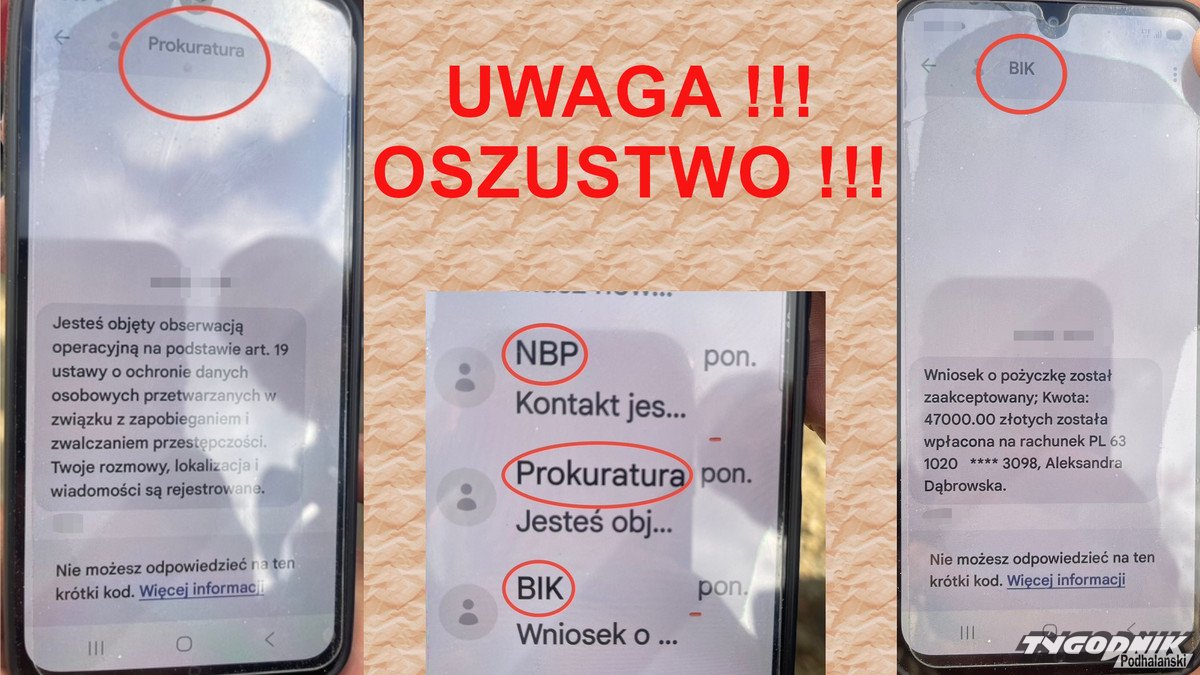 W poniedziałek, 20 października do Komendy Powiatowej Policji w Suchej Beskidzkiej, zgłosił się mieszkaniec naszego powiatu, który poinformował o próbie oszustwa. Mężczyzna odebrał telefon z numeru zastrzeżonego od rzekomej pracownicy banku, która poinformowała go o próbie zaciągnięcia kredytu na jego dane. W czasie rozmowy od razu otrzymał pierwszą wiadomość sms, której nadawca był podpisany jako Bank z potwierdzeniem zaciągnięcia kredytu w kwocie 47 tys. zł. W dalszej części rozmowy, rzekoma konsultantka banku przekazała swojemu rozmówcy, że sprawa jest już zgłoszona na Policji. Chwile później w czasie dalszej rozmowy telefonicznej 65-latek otrzymał kolejną wiadomość sms, której nadawca był podpisany jako Prokurator i jest objęty obserwacją operacyjną, a kolejna wiadomość od Biura Informacji Kredytowej (BIK). Konsultantka w rozmowie przekazała, że jedynym sposobem jest zaciągnięcie kredytu w innym banku, ale już na kwotę 80 tys. zł, tłumacząc, że to jedyny sposób, aby zabezpieczyć jego pieniądze przed kradzieżą. Cała rozmowa trwała kilkadziesiąt minut tylko po to, aby 65-latek nie odebrał innej rozmowy i nie domyślił się, że rozmawia z oszustką.