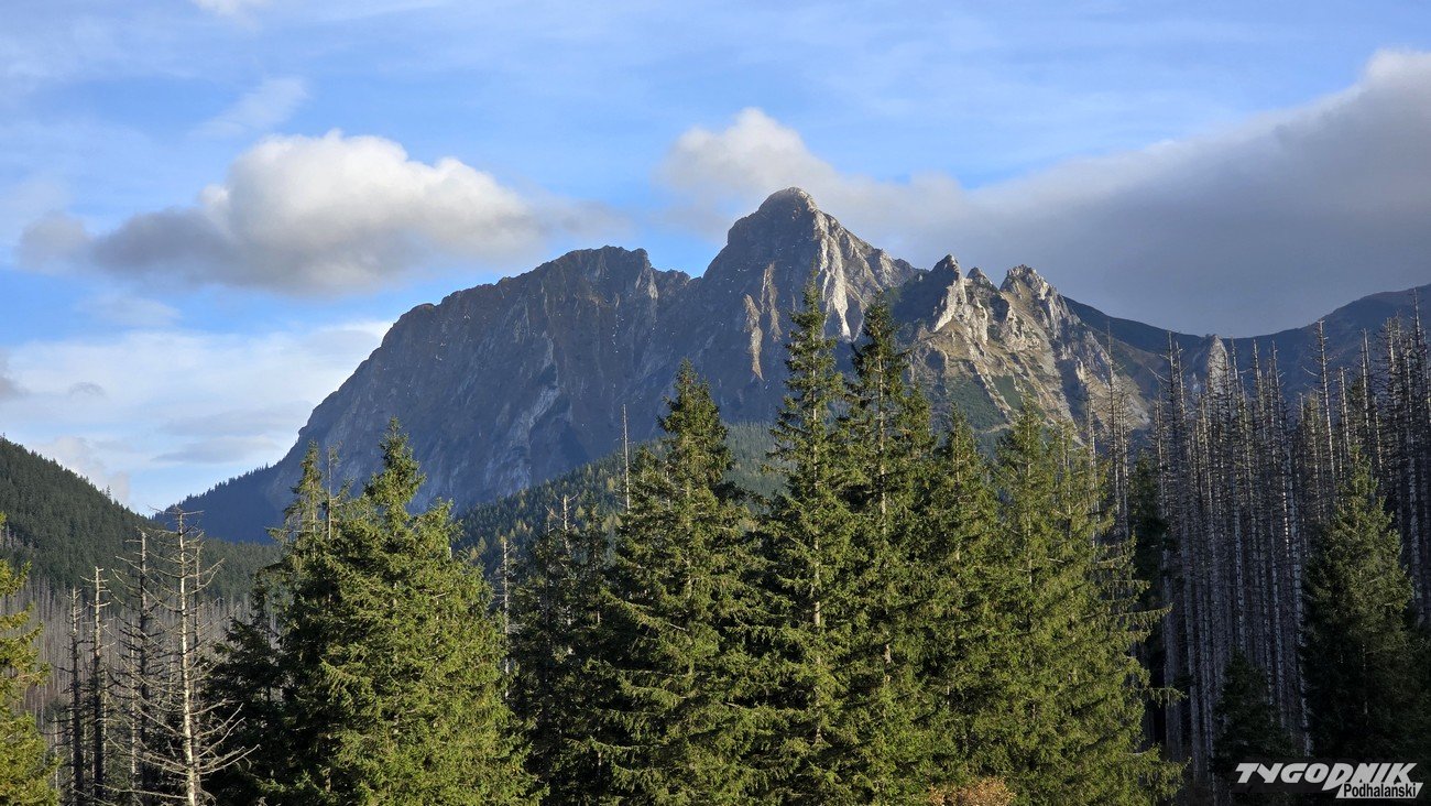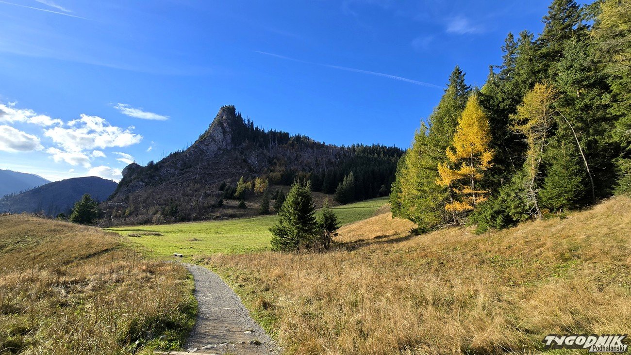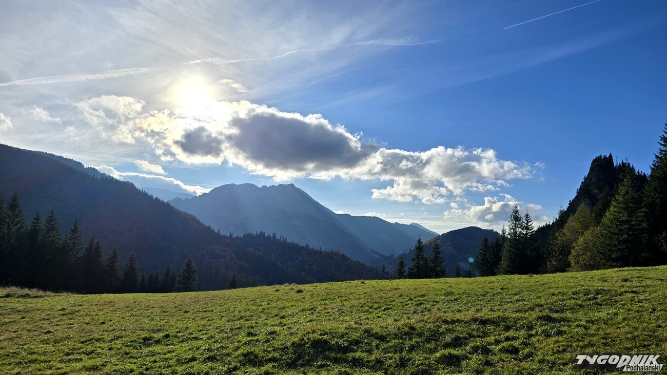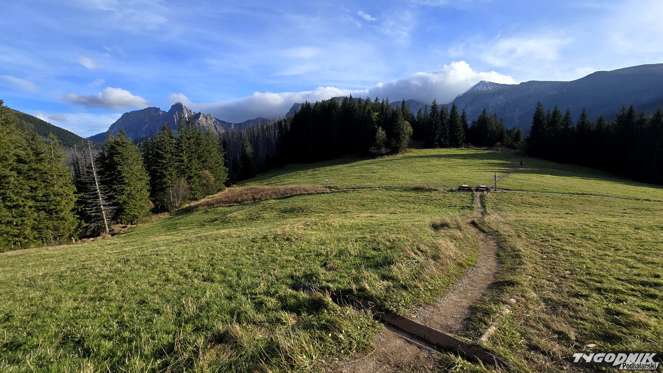 Halny na Przysłopie nie daje się jeszcze mocno we znaki, ale jego prędkość ma wzrosnąć w piątek, szczególnie wieczorem. W Tatrach może wiać do 140 km na godz., a na Podhalu do 90. Turystów na szlakach niewielu, a jesienne kolory wciąż zachwycają. Wycieczka na Przysłop jest naprawdę krótka, a można stąd podziwiać piękny Giewont, Czerwone Wierchy i Kominiarski Wierch. Dziś szczyty Czerwonych Wierchów zasłonięte były przez przetaczające się nad nimi chmury, ale na Przysłopie wyszło słońce.