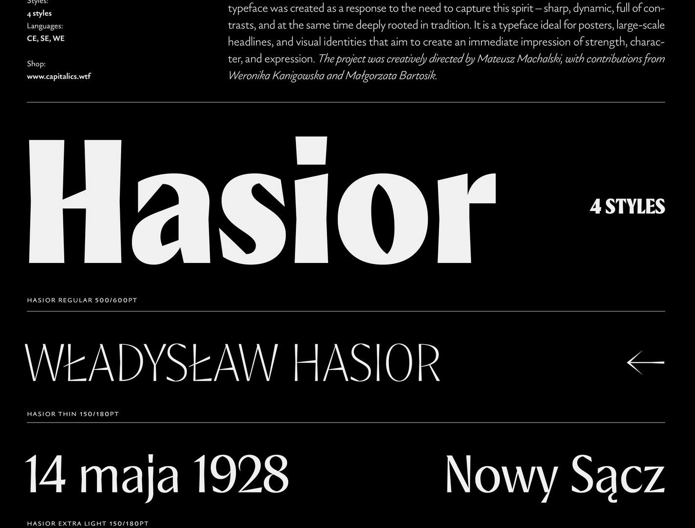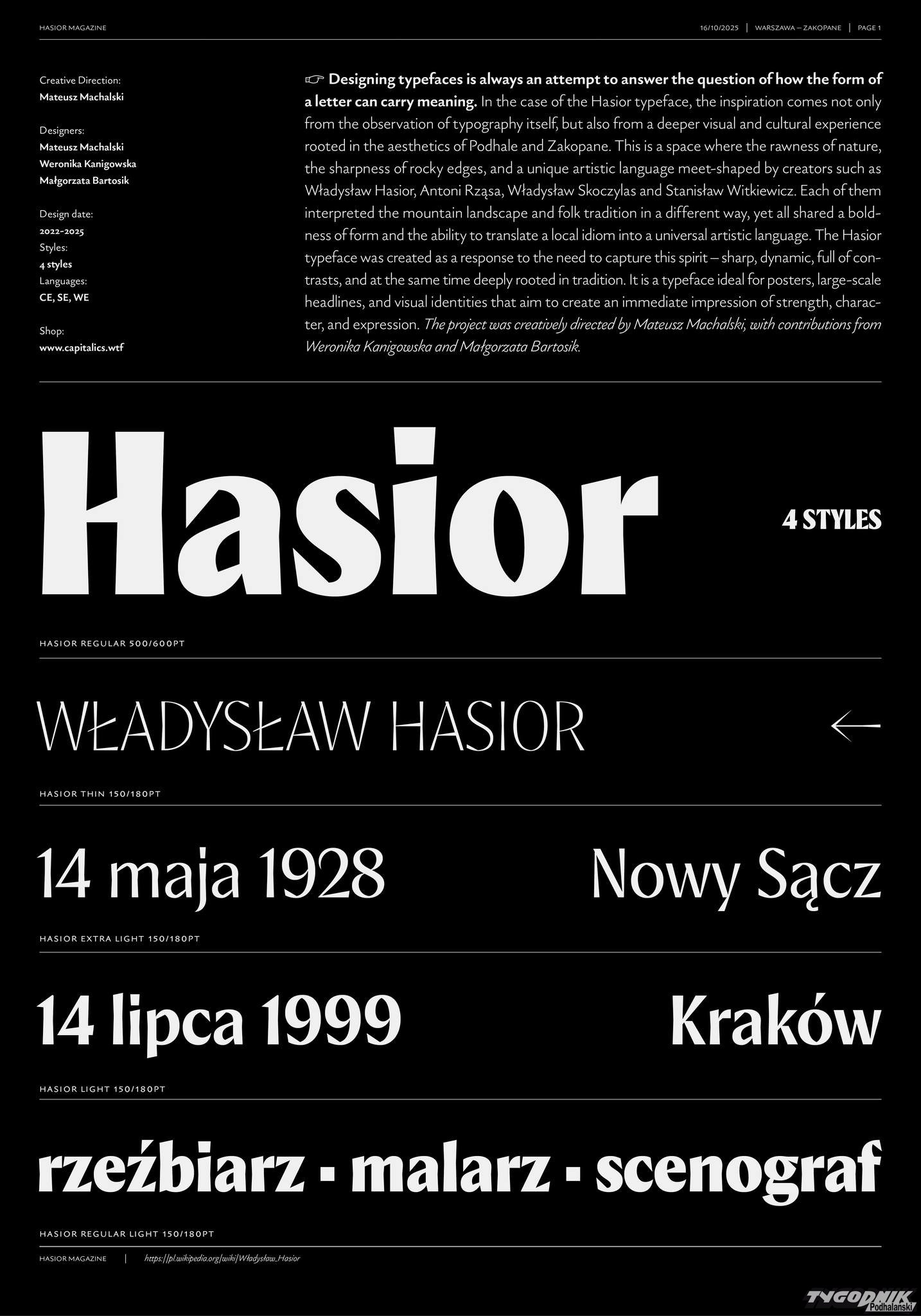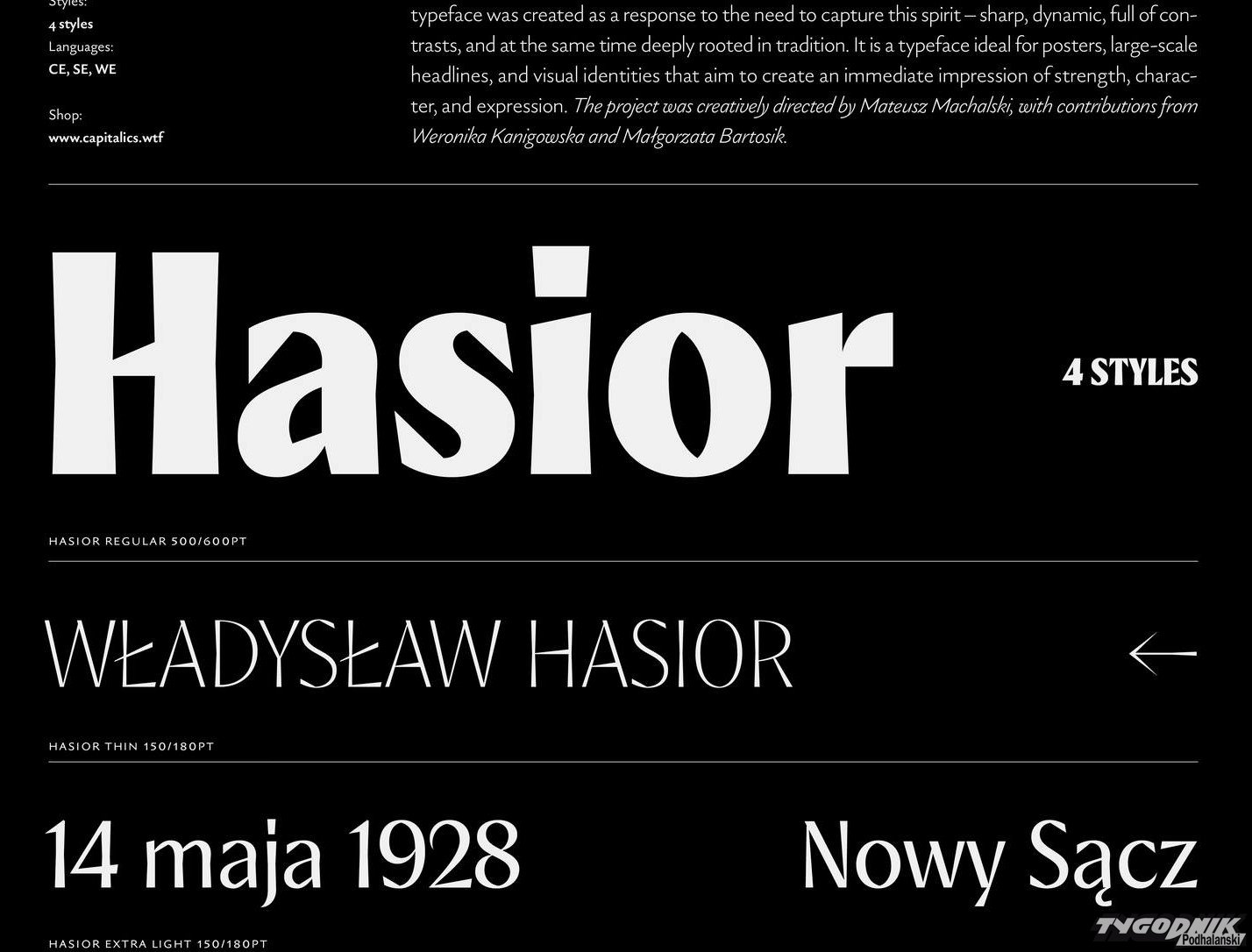 "Projektowanie krojów pisma jest zawsze próbą odpowiedzi na pytanie o to, jak forma litery może nieść znaczenie. W przypadku kroju Hasior, inspiracja wyszła nie tylko z obserwacji samej typografii, lecz również z głębszego doświadczenia wizualnego i kulturowego, związanego z estetyką Podhala i Zakopanego. To przestrzeń, w której spotykają się surowość natury, ostrość skalnych krawędzi i wyjątkowy język sztuki, budowany przez takich twórców jak Władysław Hasior, Antoni Rząsa, Władysław Skoczylas czy Stanisław Witkiewicz" - pisze w mediach społecznościowych Mateusz Michalski.