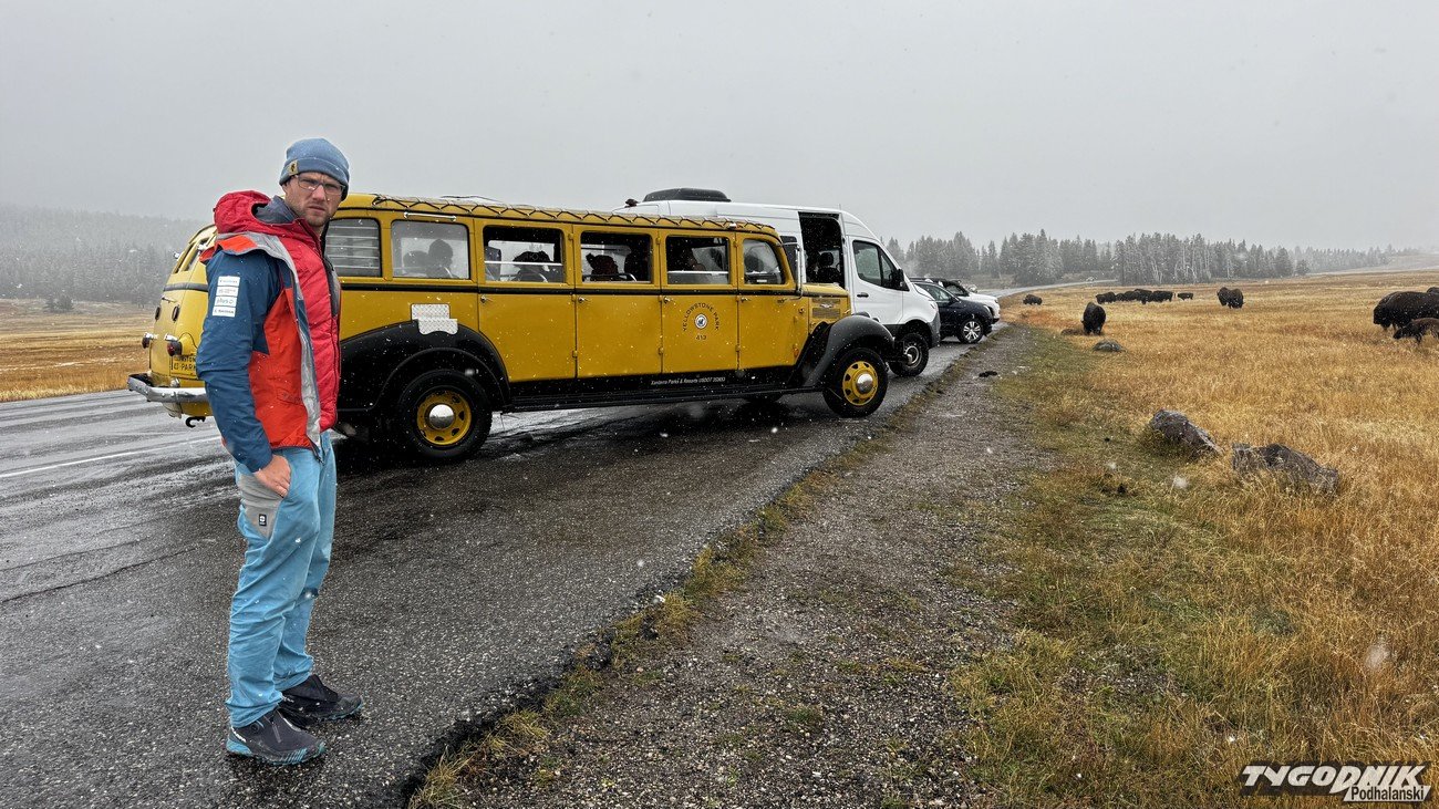 Gdy przekroczyliśmy południową bramę parku, przywitała nas zimowa bajka. Z nieba sypał śnieg – pierwszy tej jesieni – a na polanach stały spokojnie stada bizonów, ich grube futra pokryte kryształkami lodu. W oddali pojawił się samotny wilk, który powoli, niemal dostojnie, przemykał między bizonami. Nad potokiem brodził grizzly, który co chwilę podnosił głowę, jakby pilnował swojego królestwa. Nieco dalej na wzgórzu bawił się kojot, przeskakując przez śnieżne kępy i zamarznięte trawy. To była scena jak z pradawnej opowieści o stworzeniu świata – gdzie każdy gatunek zna swoje miejsce, a żaden nie dominuje nad drugim.