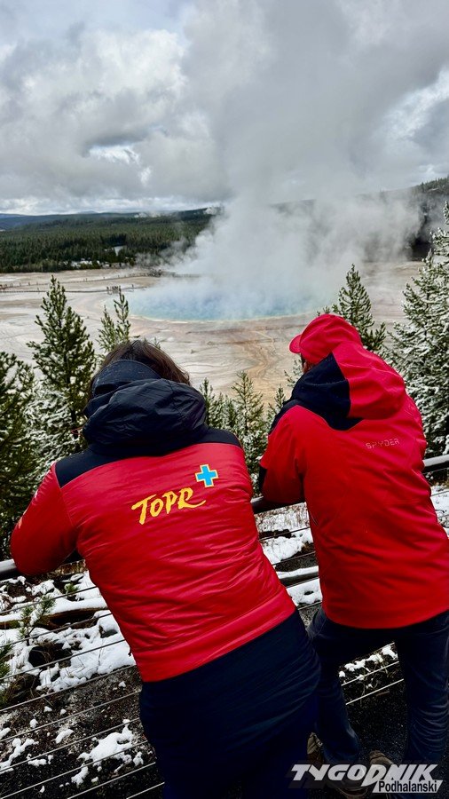 Mgły snuły się nisko, jakby ziemia oddychała. Z pól gejzerowych unosiły się chmury pary, tworząc morze obłoków o barwach srebra i błękitu. Grand Prismatic Spring mieniło się kolorami tęczy – turkus, pomarańcz, purpura i złoto drgały w chłodnym powietrzu. Z kolei Old Faithful, wierny gejzer Ameryki, wybuchł z mocą, która rozgrzała serca wszystkich obecnych. Zanim jednak to nastąpiło, kazał nam długo czekać, jak stary aktor przed finałowym ukłonem. A gdy w końcu buchnął ku niebu fontanną wrzącej wody i pary, wokół padał śnieg – mieszały się ogień i lód, kolor i cisza, przeszłość i teraźniejszość.