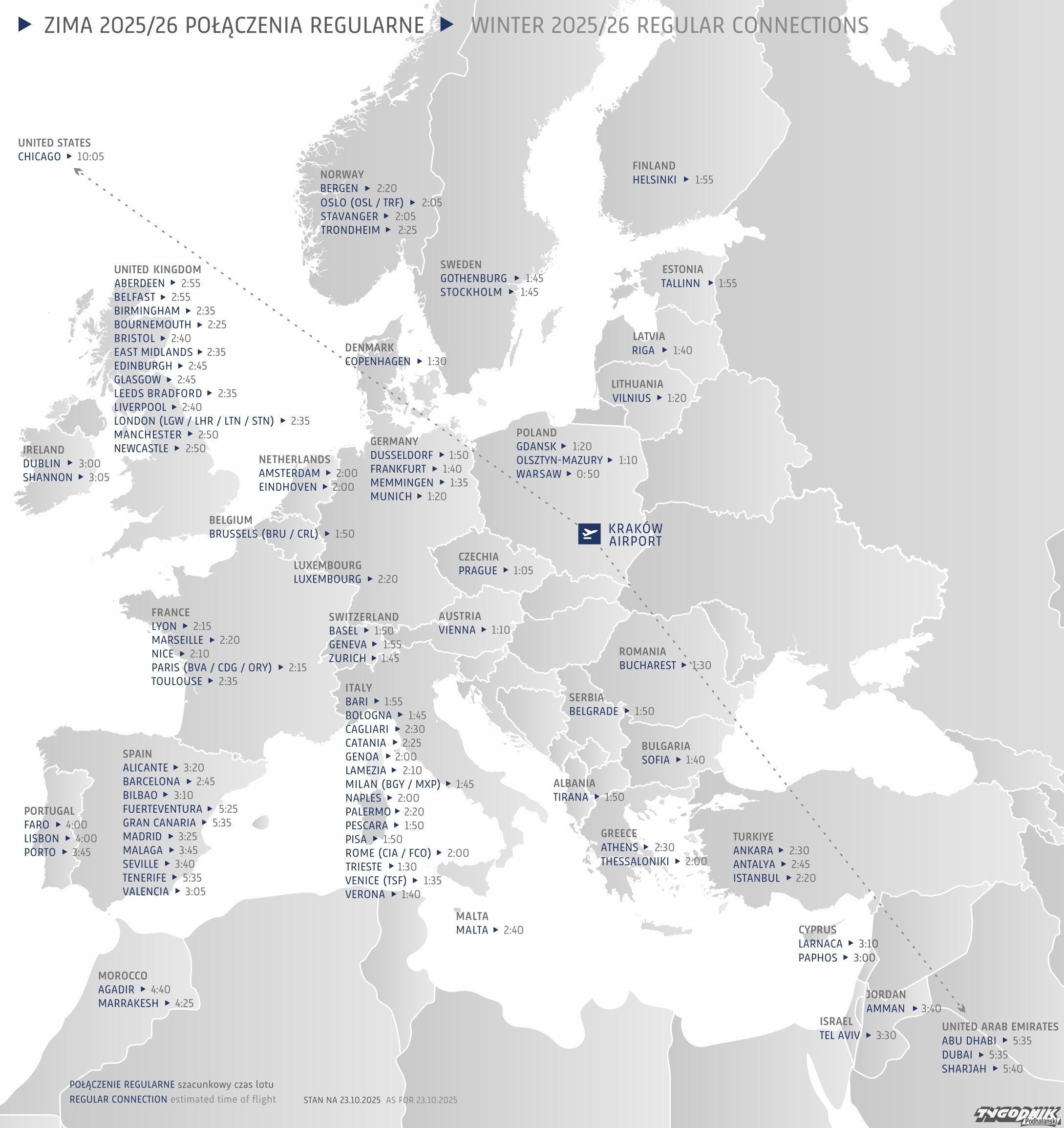 140 połączeń do 34 krajów realizowanych przez 26 przewoźników - podróżujący z Krakowa w sezonie zimowym 2025/26 będą mieli z czego wybierać! Nowa siatka połączeń zaczyna obowiązywać już w najbliższą niedzielę - 26 października.