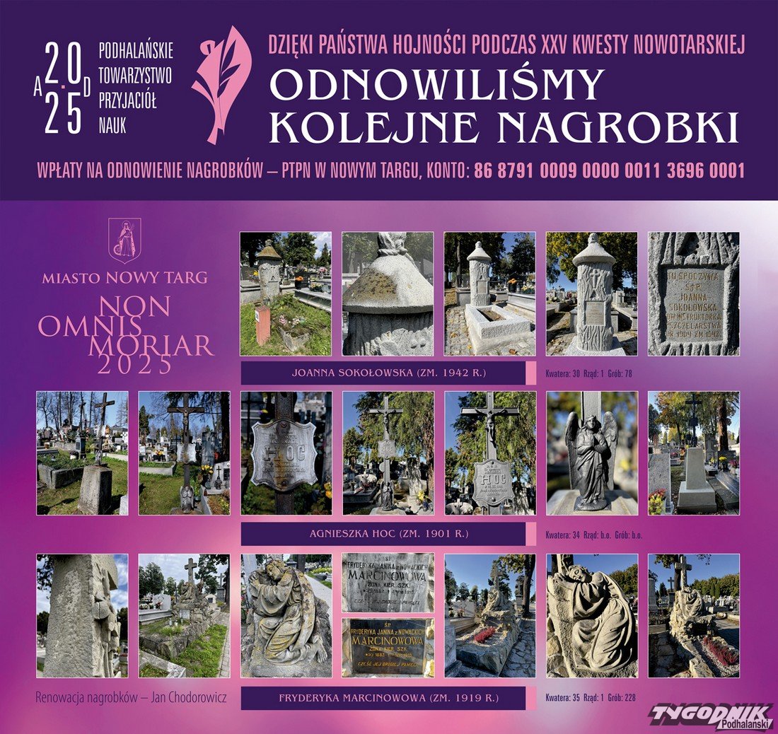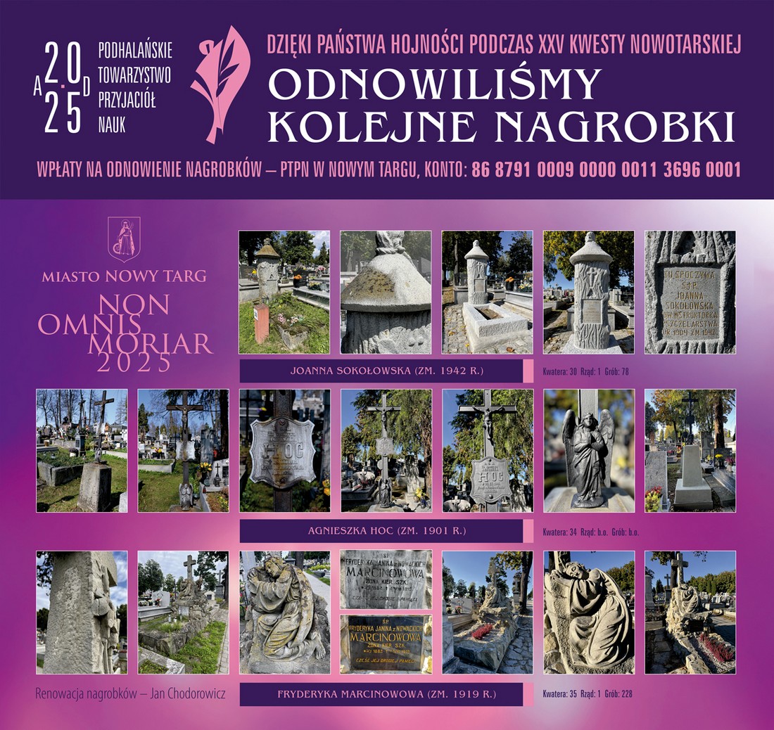 Zarząd Podhalańskiego Towarzystwa Przyjaciół Nauk w Nowym Targu wraz z burmistrzem zapraszają do udziału w XXVI Kweście Nowotarskiej, która tradycyjnie odbędzie się na nowotarskim "starym" cmentarzu 1 listopada 2025 r.