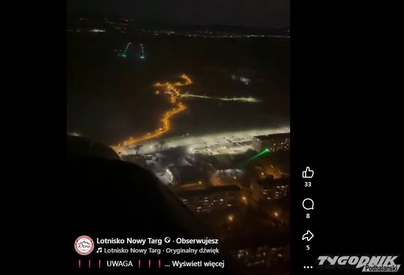 Podczas szkolenia samolotowego w ramach lotów VFR Noc na lotnisku w Nowym Targu doszło do niebezpiecznej sytuacji. Jak poinformował profil na Facebooku "Lotnisko Nowy Targ", jedna z osób z okolic bloków przy ul. Osiedle Polana Szaflarska skierowała w stronę samolotu wiązkę lasera, mogącą oślepić pilotów.