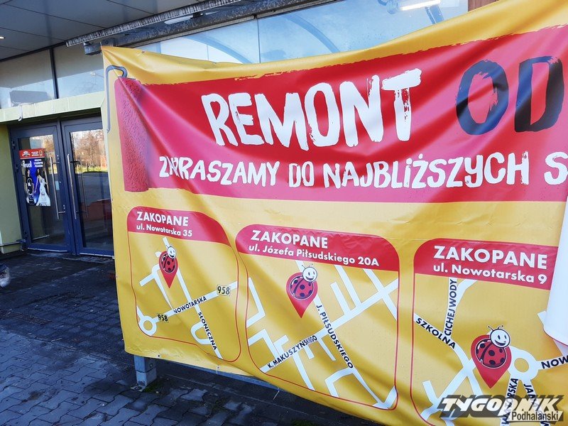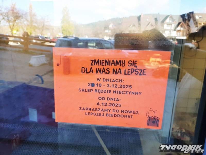 W jednym z pięciu sklepów popularnej sieci "Biedronka" w Zakopanem rozpoczął się właśnie gruntowny remont. To punkt przy Alei 3-go Maja, naprzeciw dużego parkingu u zbiegu Alei i ulicy Staszica. Pytani przez nas robotnicy powiedzieli, że prace potrwają przynajmniej trzy tygodnie. Z opisu na drzwiach wejściowych wynika, że sklep otworzy swe podwoje po remoncie dopiero z początkiem grudnia.