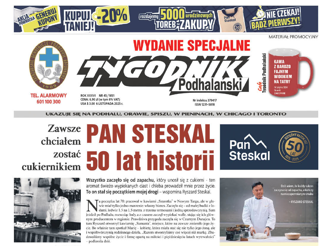 Wszystko zaczęło się od zapachu, który unosił się z cukierni - ten aromat świeżo wypiekanych ciast i chleba prowadził mnie przez życie. To on stał się początkiem mojej drogi - wspomina Ryszard Steskal. A my gratulujemy i oddajemy Steskalowi cztery strony Tygodnika Podhalańskiego.