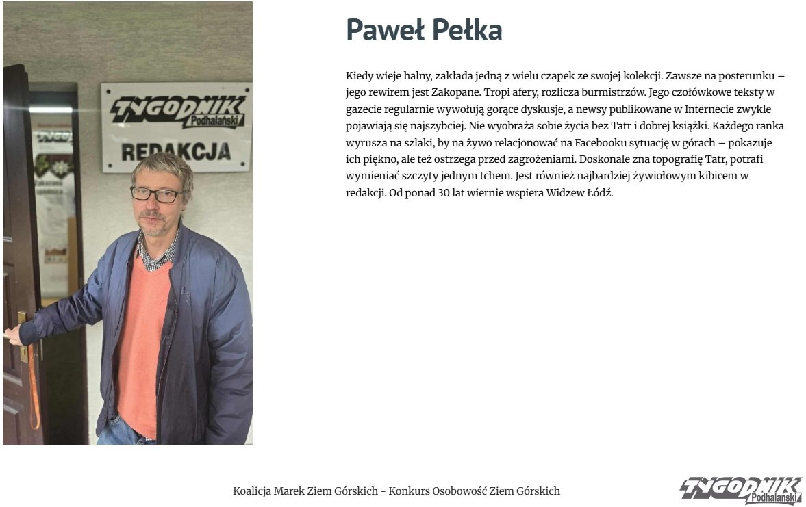 Paweł Pełka, nasz redakcyjny kolega nominowany w konkursie Osobowość Ziem Górskich