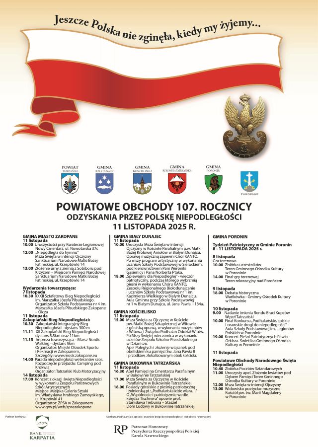 Obchody 107. Rocznicy Odzyskania przez Polskę Niepodległości odbędą się we wszystkich gminach powiatu tatrzańskiego.