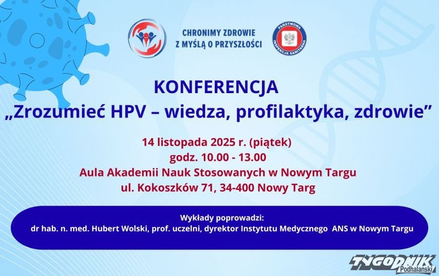 Państwowy Powiatowy Inspektor Sanitarny w Nowym Targu wraz ze współorganizatorem Akademią Nauk Stosowanych w Nowym Targu zapraszają na bezpłatną konferencję "Zrozumieć HPV - wiedza, profilaktyka, zdrowie", która odbędzie się w piątek 14.11 w godzinach 10-13 w Auli ANS (ul. Kokoszków 71). Zapisy do 10.11.