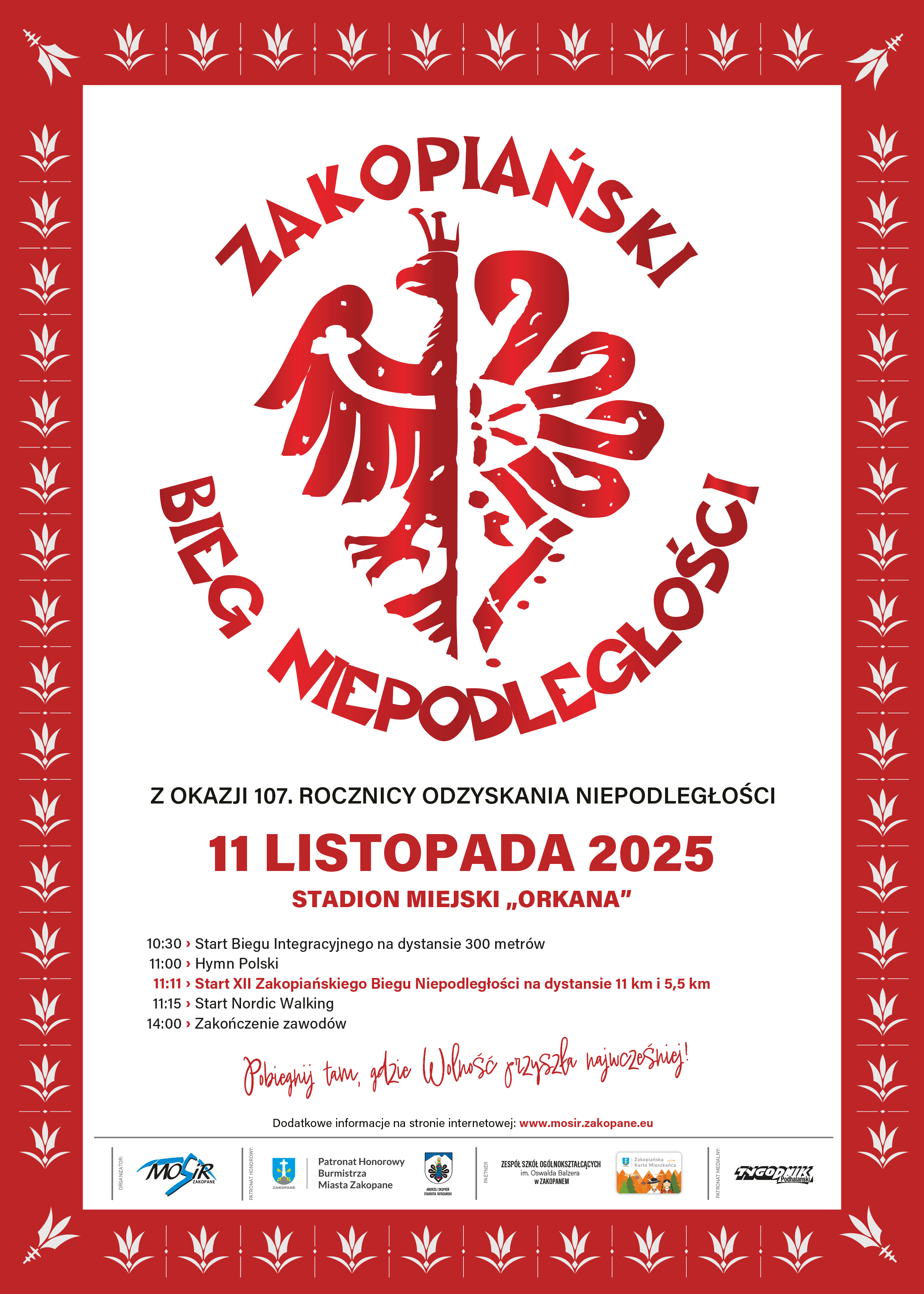 Miejski Ośrodek Sportu i Rekreacji w Zakopanem zaprasza do udziału w Zakopiańskim Biegu Niepodległości i Integracyjnym Zakopiańskim Biegu Niepodległości oraz Marszu Nordic Walking. Wszystkie wystartują 11.11.