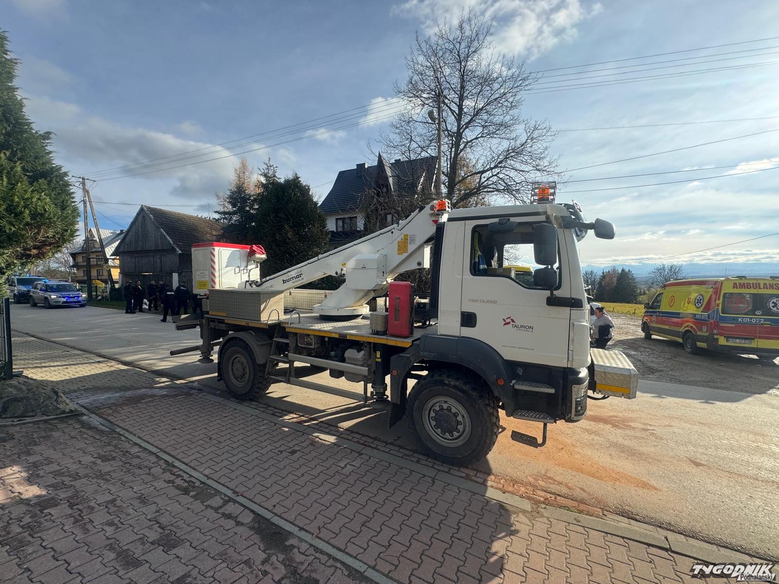 Senne jesienne przedpołudnie, ruch na głównej drodze w Załucznem niewielki. W zasadzie można by wyciągnąć pochopny wniosek, że nic się nie dzieje, gdyby nie mieniące się przy wjeździe do wioski od strony Odrowąża kilkanaście niebieskich "kogutów". Na poboczu drogi stoi mocno zestresowana ekipa monterów Tauronu. Nie chcą mówić co zaszło, tylko wymownie rozkładają ręce i odsyłają po informacje do policjantów. Tych też na miejscu nie brakuje. Aż ich trudno policzyć. Dość powiedzieć, że gdy się przymruży oczy – horyzont przybiera niebieską poświatę…