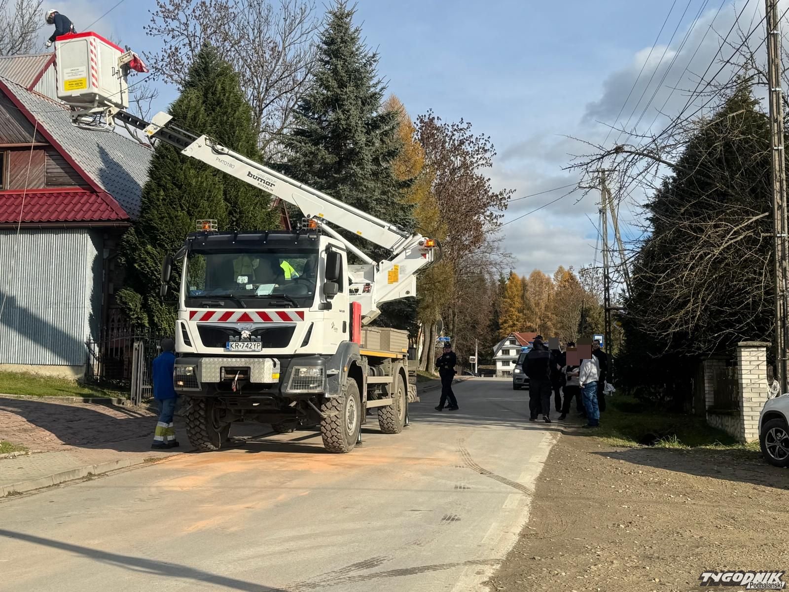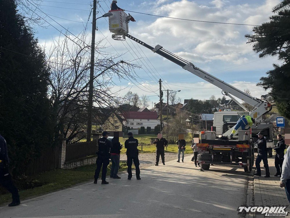 - Chodzi o to, że ci państwo po lewej remontowali dom no i postanowili też wymienić stare linki, które stanowiły przyłącz energetyczny. Sprawę zgłosili w Tauronie. No jak już wszystko zostało przygotowane, to przyjechał Tauron i próbował te druty podczepić do tego samego słupa po przeciwnej stronie drogi. To wtedy wylecieli sąsiedzi z przeciwka i powiedzieli, że nie pozwolą bo słup stoi na ich działce – relacjonuje z przejęciem młoda brunetka, która zajście z wypiekami na twarzy obserwuje od 10.00.