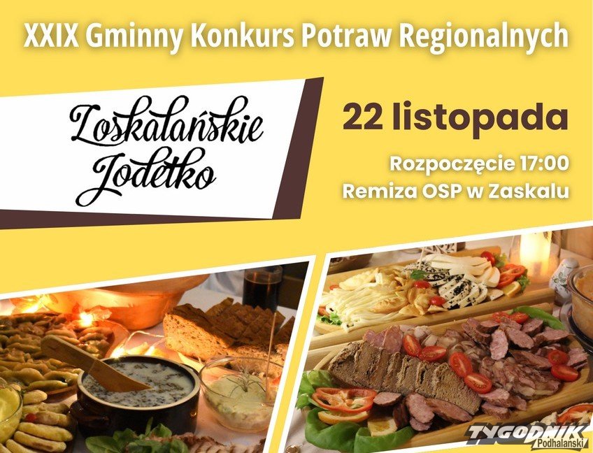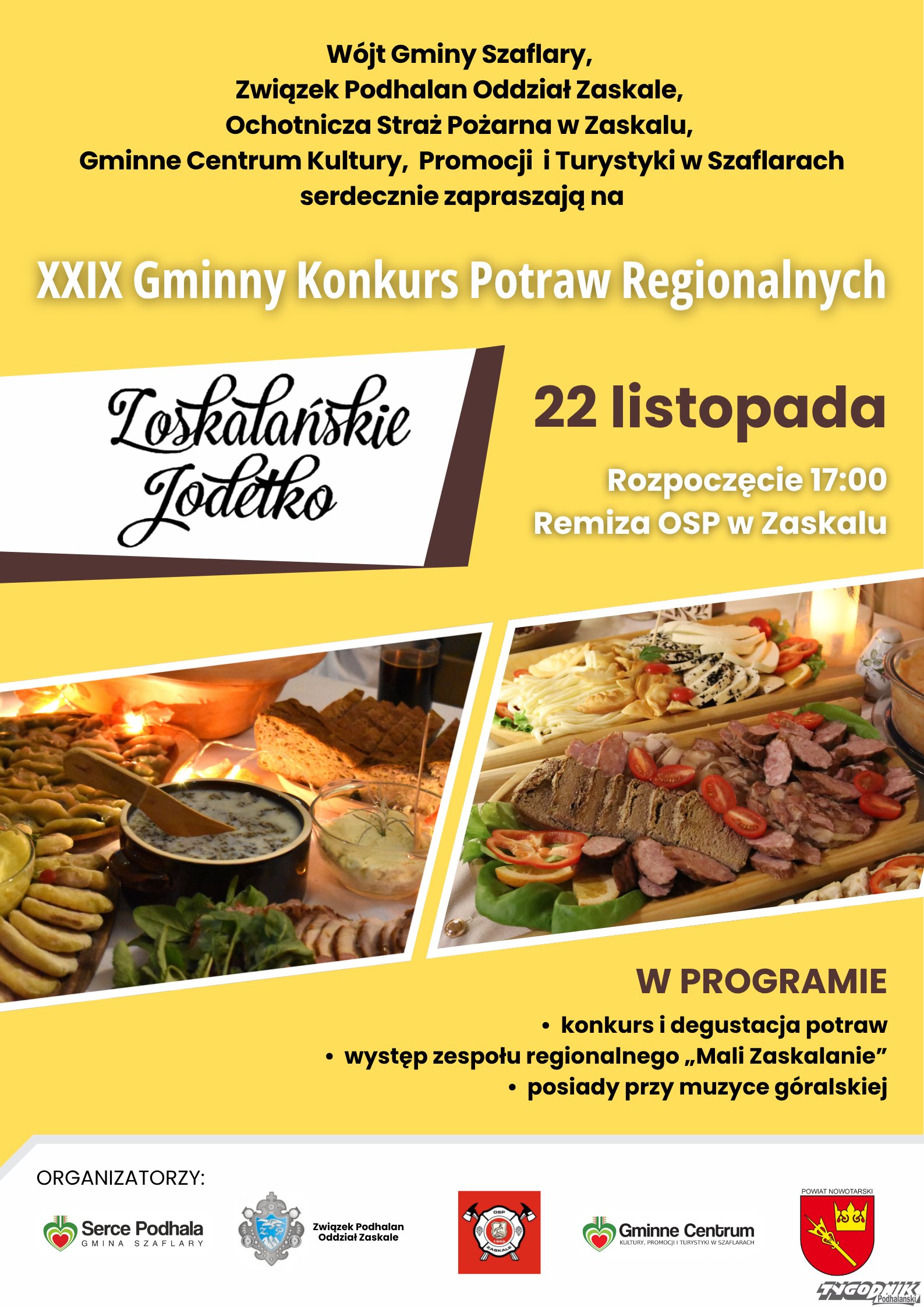 Wójt Gminy Szaflary, Oddział Związku Podhalan w Zaskalu, Ochotnicza Straż Pożarna w Zaskalu oraz Gminne Centrum Kultury, Promocji i Turystyki w Szaflarach zapraszają na XXIX Gminny Konkurs Potraw Regionalnych "Zoskalańskie Jodełko".
