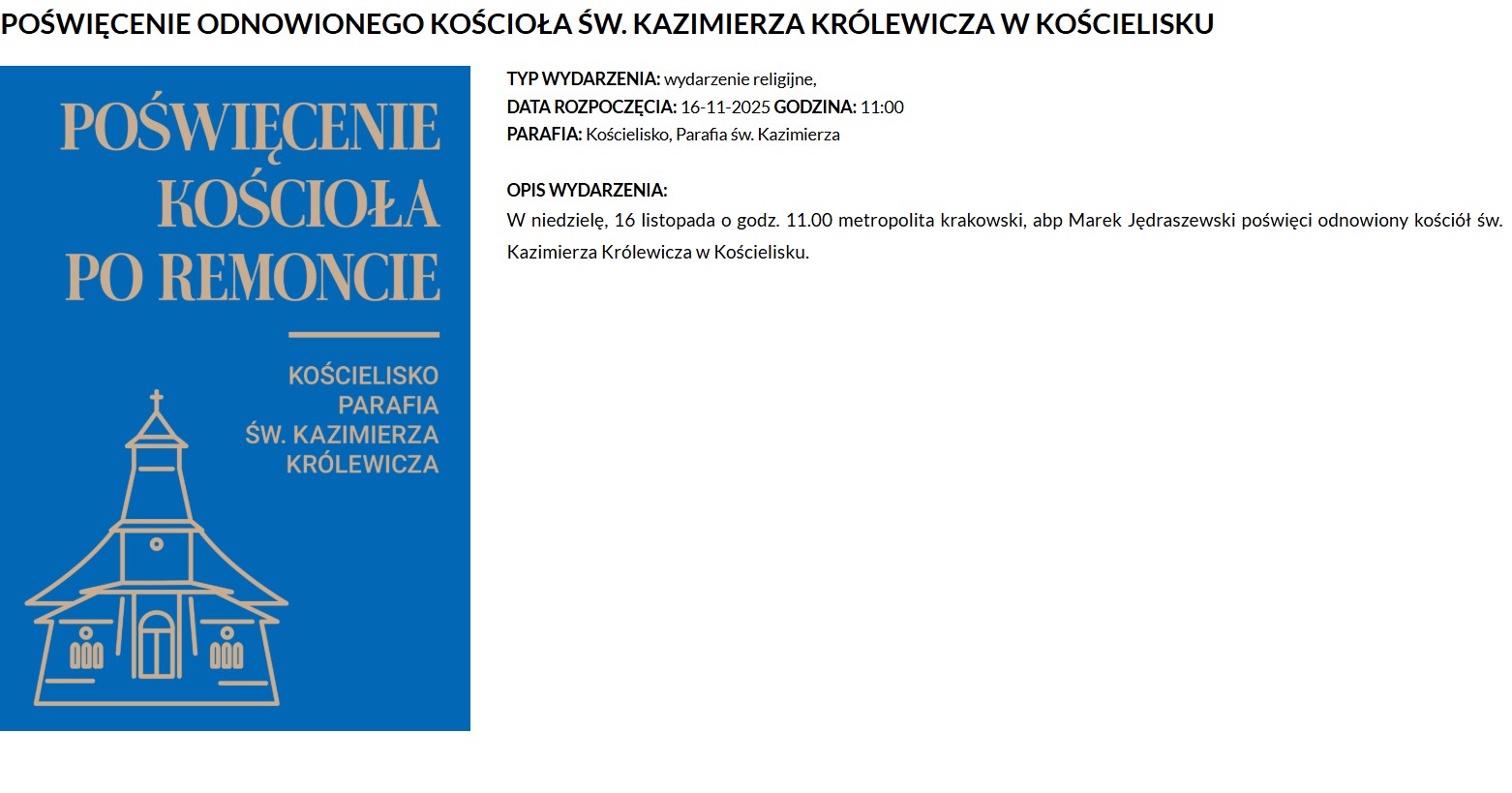 W najbliższą niedzielę, 16 listopada 2025 roku, w Kościelisku odbędzie się uroczystość, na którą od wielu miesięcy czekali parafianie oraz wszyscy związani z lokalną wspólnotą. O godzinie 11.00 metropolita krakowski, arcybiskup Marek Jędraszewski, dokona poświęcenia odnowionego kościoła św. Kazimierza Królewicza - jednej z najważniejszych świątyń na Podhalu.